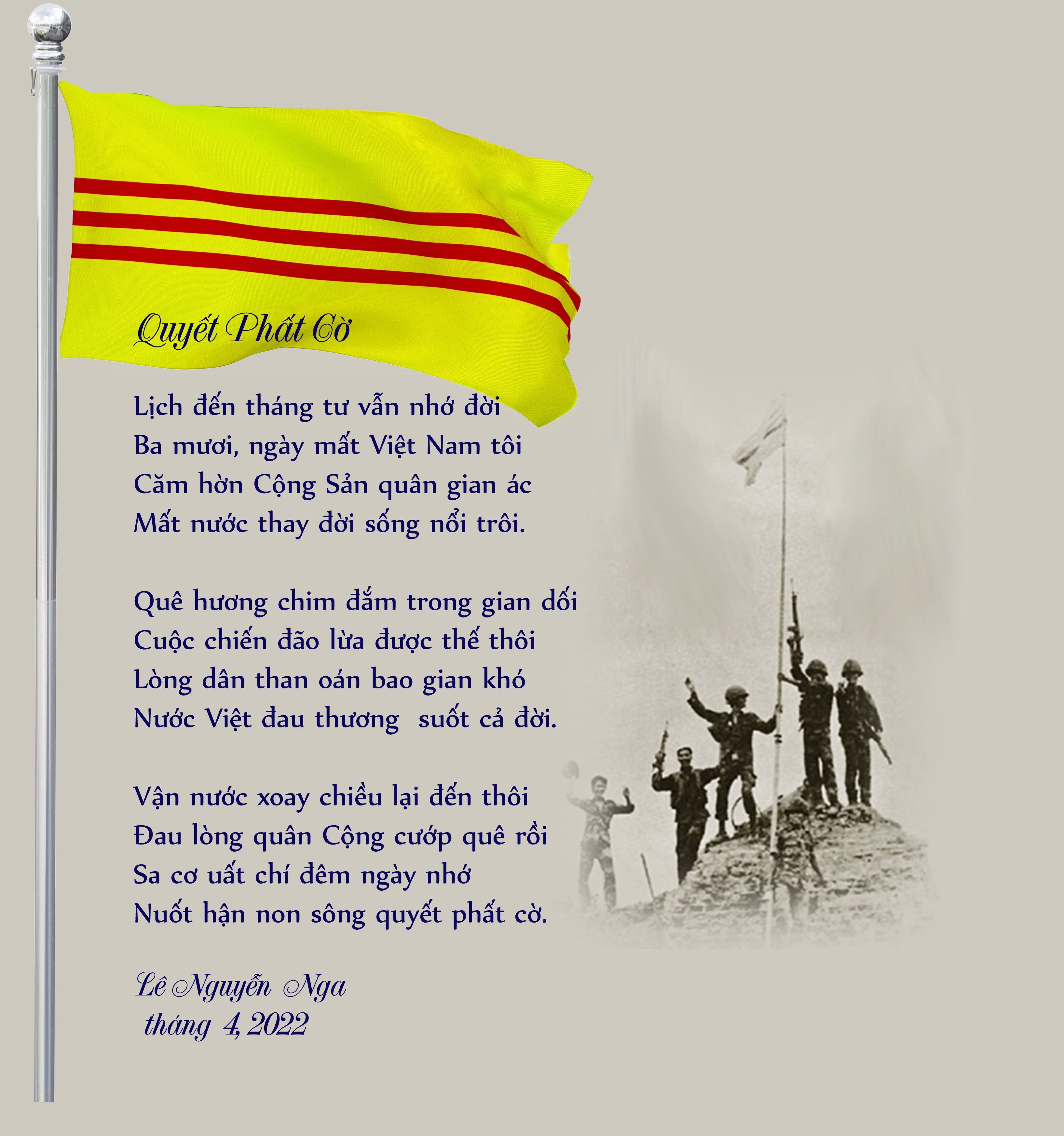 | Nhớ Ngày Quân Lực Nhớ những ngày xưa nhớ nước non Vào Ngày Quân Lực kết lòng son Quân dân liên kết tình thương mến Nhớ mãi chiến y đẹp thuở còn Tung cánh chim bằng, tuôn kiếm báu Xuất quân vung kiếm diệt câm hờn Phù nhà cứu nước, tình quê thắm Giữ nước, diệt gian khí tiết tròn. Lê Nguyễn Nga – 2024 Kỷ niệm 19 tháng 6 Ngày Quân Lực VNCH. |