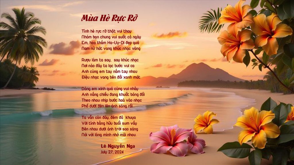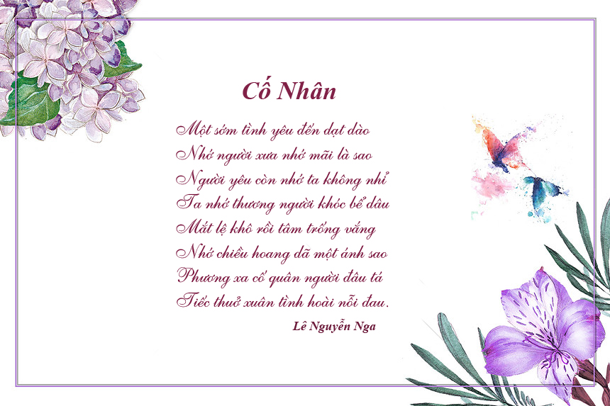 BỐN MÙA HẸN ƯỚC Đông đang đến trong sương mờ lạnh giá Chuỗi ngày dài nắng ấm đã trôi qua Hàng cây không lá như dáng ai gầy Lòng em vẫn mong ngày anh trở lại Mùa xuân ấy anh ra đi giúp nước Mong cùng xây một mái ấm tình yêu Đem tư do hạnh phúc với niềm tin Quê hương sẽ thanh bình như mong ước Mùa Hạ tràn nắng ấm anh xa bước Xa ngày nào anh đưa đón trường xưa Tiếng ve kêu âm hưởng giữa trưa hè Hoa Phượng thắm như làn môi tuổi trẻ Mùa Thu về lá vàng rơi khắp nẻo Ta hôn nhau âu yếm những chiều thu Tay trong tay trên đường xưa là đổ Bên nhau ta nhìn lá rơi ngập lối Anh đã hứa khi Đông về những tối Ta thì thầm mơ ước chuyện lứa đôi Hứa với anh em sẽ mãi đợi chờ Chờ giây phút đôi ta mừng duyên mới Bốn mùa qua lòng em cầu nguyện ước Đón anh về sưởi ấm lại tình xưa Trên cành khô nghe như chân ai bước Có phải anh về kết nối duyên xưa? Lê Nguyễn Nga DEC 2024 |