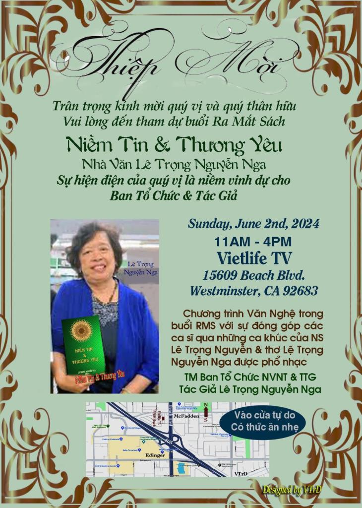 | LÊ NGUYỄN NGA I-Tiểu sử: • Tên thật là Nguyễn Thị Nga, sinh ngày 03-01 năm 1945 tại Cần Thơ. • Cha mẹ là người Bắc Giang, vào Nam làm việc cho chánh phủ Pháp và Việt Nam từ năm 1934. • Lúc trẻ, từ 1958 học tại trường Việt Nam học đường. • Năm 1963, học một năm trung học tại trường Trưng Vương. Đậu tú Tài năm 1964. • Tháng 01- năm 1968 làm việc cho hãng Hàng Không Việt Nam, tại Trạm Vé. • Nhân viên quay về, Air VietNam – Văn phòng trên đường Lê Lai Sài Gòn. • Tháng 12, năm 1970 kết hôn với chồng là Lê Trọng Nguyễn Ông bà có được 4 người con, 3 gái và 1 trai. II- TẠI HẢI NGOẠI • Từ năm 1983 sang định cư tại Cali, Hoa Kỳ theo diện Orderly Departure Program – ODP. • Năm 1989, Graduated Bachelor Degree in Business Administration Accounting tại Đại Học – California State University Los Angeles- CSULA.. • Từ năm1989 – 5/1993 là nhân viên, với chức vụ GAIN Case Manager của MAXIMUS- Chương trình GAIN. • Từ năm 5/1993, là nhân viên của Los Angeles County. Department Public Social Services- LA COUNTY- DPSS. CT. GAIN -Greater Avenue for Independence • Từ năm 1997, giữ chức vụ GAIN Services Supervisor, cho đến ngày hưu trí February- 2017. III- SINH HOẠT Đã sinh hoạt trên đất Hoa Kỳ • Vice President of Vietnamese Employees Association in the Los Angeles County ( VEALAC) 1995-1999. Hai nhiệm kỳ • Chủ biên Tập Tuyễn Nhạc Lê Trọng Nguyễn và phát hành 2 CD2 Lê Trọng Nguyễn 2005- 2006. • Chủ bút tờ Đặc San Hàng Không Việt Nam năm 2006. • Trong Ban Chấp Hành Hội Ái Hữu Hàng Không Việt Nam từ năm 2004 cho đến 2015 – Với Chức vụ đã làm qua: Tổng Thơ Ký , Hội Trưởng và trong ban Cố Vấn. • Năm 2013 trong Ban Điều Hành của “ Không Gian Tình Nghệ Sĩ “,Chương trình chiếu trên đài IBC 57.8 • Năm 2013 sáng lập và điều hợp chương trình Tình Quê Hương trên đài IBC TV. Giới thiệu Văn Học, Nghệ Thuật, Xã Hội. Chiều mỗi tuần trên đài IBC, bằng tầng 57.8 Tác Phẩm “ Lật Trang Sách Cũ “ của Tác giả Lê Nguyễn Nga xuất bản năm 2014. Tái xuất bản Mar. 2020- do nhóm Nhân Văn Nghệ Thuật vàTủ Sách Khai Trí. • Từ năm 2014 cho đến nay Nhà Văn Lê Nguyễn Nga là Hội Viên Văn Bút Việt Nam Hải Ngoại vùng Tây Nam Hoa Kỳ. • Từ Năm 2020- 2022 trong Ban Đại Diện VBVNHN Tây Nam HK, với chức vụ Tổng Thư Ký. |