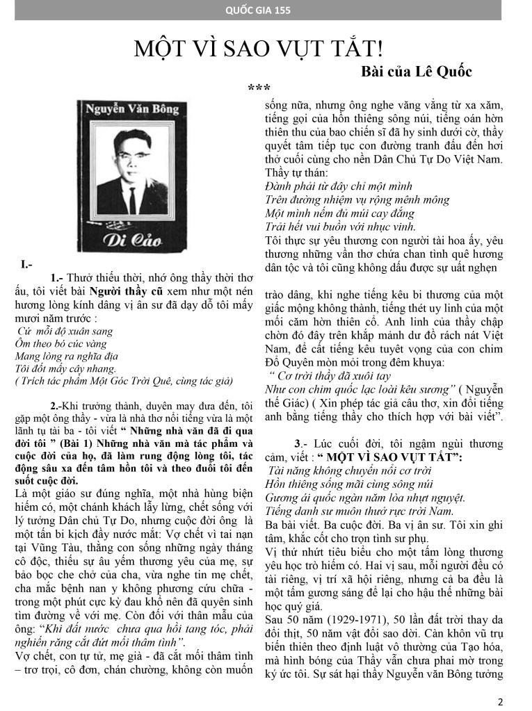 | MỘT VÌ SAO VỤT TẮT Bài đã đăng tại báo CĐNVQG số 155 Tết Nhâm Dần. Gửi lại quý vị xem thêm một lần nữa để tưởng niệm một tài năng đã nằm xuống vì Tổ Quốc. Bài đăng báo còn thiếu mấy dòng chữ ghi trên tấm mộ bia để nằm dài trước mộ phần của Giáo sư Nguyễn văn Bông ( được cải tang về chôn tại Mỹ) : HỌC VIỆN KHÓC DANH SƯ PHONG TRÀO ĐAU LÃNH TỤ NHÂN DÂN BUỒN CHÍ SĨ TỔ QUỐC XÓT TÀI HOA |