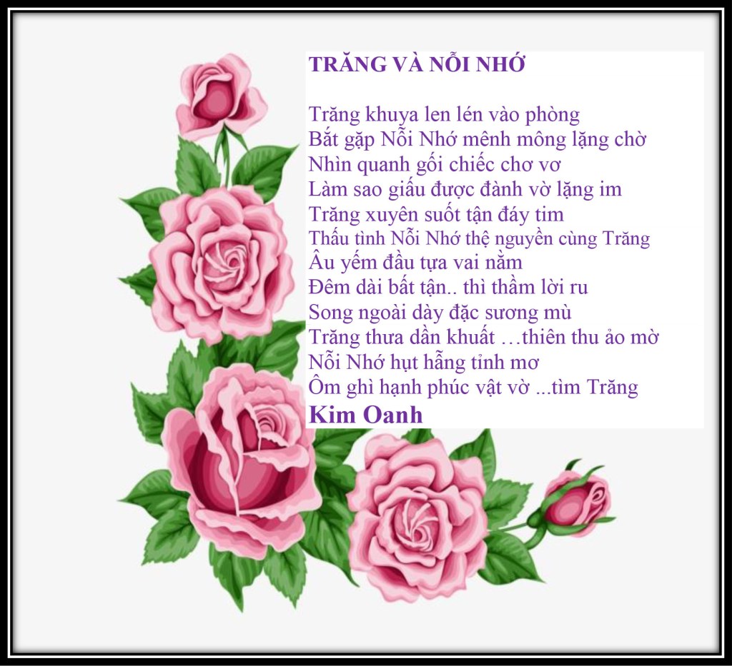 | Nhớ Ngày Xưa Ấy Gom thương nắn nót từng lời Viết lên nỗi nhớ vẽ vời chữ yêu Tương tư thả xuống bến chiều Theo dòng mơ mộng ít nhiều đến ai Bao mùa phượng thắm vần xoay Binh minh nắng mới men say như vừa… Hoàng hôn dù nhạt màu mưa Nhớ Ngày Xưa Ấy hương thừa ấp yêu Kim Oanh |