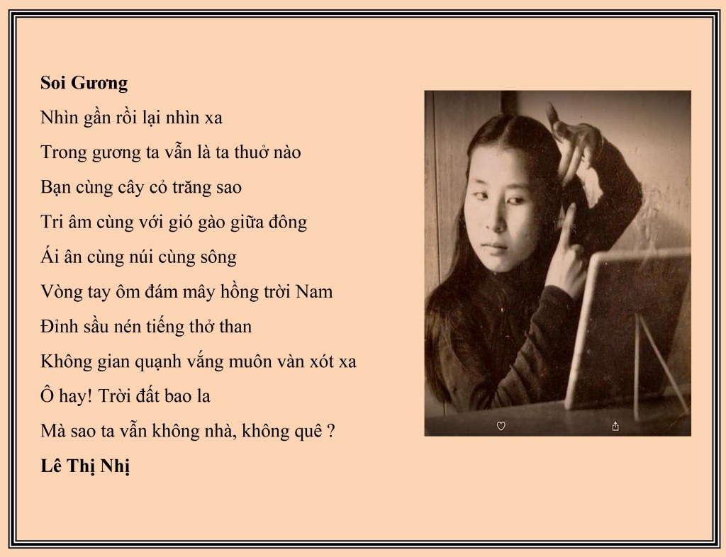 | LOOKING IN THE MIRROR OBSERVING FROM NEAR THEN FROM AFAR MY REFLECTION FROM THE MIRROR IS STILL MINE AS IN THE PAST TREES, EARTH,MOON, STARS AND I ALONG WITH EMPATHETIC MID-WINTER HOWLING WINDS MAKING LOVE WITH MOUNTAINS, MAKING LOVE WITH RIVERS ARMS WIDE OPEN HUGGING THE PINK CLOUDS OF THE VIETNAM SKY MELANCHOLY SUPPRESSES LAMENTS EMPTINESS FILLED WITH IMMENSE SORROW OH VAST HEAVEN AND EARTH WHY HAVE I NEITHER HOME NOR COUNTRY? LÊ THị NHỊ |