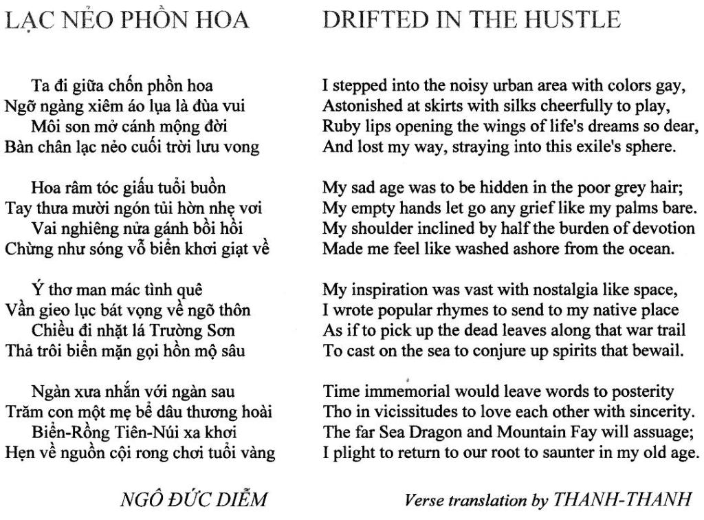 | ** Ðã góp phần phiên-dịch trong các tuyển-tập thơ Việt-Mỹ tại Hoa-Kỳ: *“The Silence of Yesterday” của “Cơ Sở Thi Văn Cội Nguồn” của Song Nhị ở San Jose, bắc California; *“Flowers of Love” I, II, III, IV của “Hội Thơ Tài-Tử Việt-Nam” của Như Hoa ở Dallas, Texas; *“The Old Days” của Như Hoa ở Sacramento, bắc California, 2001; *“Poems in Rain & Flowers” của Vi Khuê ở Burke, Virginia; *“Tiếng Hót Loài Chim Di” của Song Nhị ở San Jose, bắc California, 2004; *“Viet Pen” của “Trung Tâm Văn Bút Việt Nam Hải Ngoại” qua Yên Sơn ở Spring, Texas, 2010; *“Ru Thầm Tiếng Gọi Việt Nam” của Ngọc An ở San Jose, bắc California, 2013 ; *“Còn Lại Chút Tình” của Nguyễn Phú Long ở Glen Allen, Virginia, 2016; *“Suối Nguồn Tâm Thức” của Thái Tú Hạp ở Rosemead, nam California, 2019; |