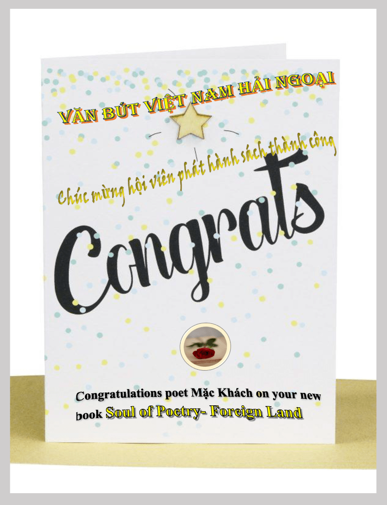 | KHAI BÚT Khai bút đầu Xuân nét hóa rồng Tha hương vinh dự giống Tiên Long Bao năm phấn đấu người Di tản Lưu lại tài danh máu Lạc hồng Xứ lạ buồn đêm luôn khắc khoải Quê người thao thức mãi hoài trông Mai về bơi lội dòng sông cũ Buông hết thương đau nhẹ cõi lòng ! MẶC KHÁCH |