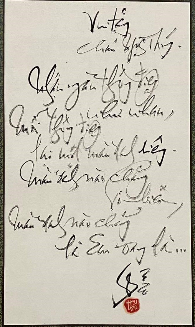 Màu Xanh Vô Biên ![]() Thư pháp của thi sĩ Trụ Vũ Tập truyện Long Lanh Màu Trời ra đời như một món quà tôi mừng tôi tròn tuổi. Vì tình hình dịch bệnh, sách đặt ở Mỹ gởi sang Đức có thể rất chậm trễ. Anh Lê Hân, nhà xuất bản Nhân Ảnh đề nghị, đặt thử một cuốn trực tiếp qua Amazon. Tôi gọi điện thoại cho con trai, thủ thỉ kể chuyện. Con tôi vui vẻ: – Mẹ để con lo chuyện này. Vì dịch, con không thường xuyên về thăm nhà được. Con sẽ đặt Amazon gởi sách thẳng về nhà mẹ. Nhưng sau đó, con tôi đổi ý, dặn dò: – Mẹ chịu khó chờ nghe. Con muốn mang sách về, trao tận tay cho mẹ. Thời gian sau, tình hình dịch bệnh bớt căng thẳng, các quy định giãn cách xã hội được nới lỏng, gia đình chúng tôi mới có dịp sum họp. Con tôi trao cho tôi cuốn sách màu xanh, giọng ấm áp: – Con thương Mẹ lắm. Mẹ mở sách ra coi liền đi. Con tôi thường tặng sách cho tôi. Bất kể, sách tiếng Việt, tiếng Anh, tiếng Đức, con tôi luôn ghi lời đề tặng bằng tiếng Việt. Tôi mân mê cuốn sách trong tay, hồi hộp mở trang đầu. Ô, đây rồi, nét chữ viết tay thương yêu của con. “Hoàng Quân tặng cho Hoàng Quân cuốn sách của Hoàng Quân”. Lời đề tặng của con có mấy chữ đơn sơ, mà tràn đầy ý nghĩa. Ngày trước, con tôi chỉ cảm thấy vui vui, khi tôi nói, tôi dùng tên con làm bút hiệu. Giờ đây, con tôi đã để ý, dõi theo những sinh hoạt viết lách của tôi với tên của con. Cầm đứa con tinh thần trong tay, tôi ôm chầm đứa con bằng xương bằng thịt, lòng hạnh phúc tràn trề. ![]() Cả thế giới khốn đốn, chống chỏi với cơn đại dịch. Chẳng ai được là ngoại lệ. Cuộc sống của nhân loại bị xáo trộn hoàn toàn. Mọi người phải đối đầu với nhiều thay đổi. Lẽ thường, gần gũi, gặp gỡ, giao tiếp là những biểu hiện tình cảm của người với người. Nhưng trong tình hình dịch bệnh, người ta phải làm ngược lại. Bà Merkel, Thủ Tướng nước Đức, “năn nỉ” toàn dân hết lời: “Xin đồng bào hãy vô cùng thận trọng. Trong lúc này, chỉ có khoảng cách mới thật sự thể hiện sự lo lắng, quan tâm lẫn nhau mà thôi. Im Moment ist nur Abstand Ausdruck von Fürsorge.” Cũng may, kết nối trên liên mạng tạm thời bù đắp những thiếu thốn tình cảm trong thời gian ngăn sông, cấm chợ. Người ta có thể nhìn nhau, nói chuyện với nhau, dẫu chỉ là sinh hoạt trong thế giới “ảo”. Nhờ những người đưa thư “ảo”: email, messenger, whatsapp... tôi có thể thường xuyên liên lạc với gia đình, người thân, cũng như nhận được những lời thăm hỏi từ bạn bè những cảm nghĩ viết vội sau khi đọc tập truyện Long Lanh Màu Trời. Người bạn cùng lớp thuở trung học chia sẻ: “Trong tập truyện Long Lanh Màu Trời, mình thích nhất tiểu phẩm “Biếc”. Mình rất thích chữ “biếc”, nhất là sau khi đọc câu: Nụ tầm xuân nở ra xanh biếc/ Em lấy chồng anh tiếc lắm thay. Một chữ “biếc” thả xuống rất là ý nhị và tròn đầy…” Tôi lơ mơ nhớ những ngày tháng học trò khờ dại. Ờ nhỉ, suốt thời gian chung lối thuở ấy, không chừng tôi cũng có lần cuống quýt vân vê tà áo, khi bắt gặp ánh mắt của bạn. Ô, không biết bạn đã có lần nào đêm khuya thao thức viết thư chăng. Tôi chưa kịp qua phút bâng khuâng, bạn vui miệng kể tiếp. Mẹ của bạn, thấy bạn đọc cuốn sách màu xanh say sưa, chốc chốc lại mỉm cười. Cho nên, bà bảo, cho bà mượn cuốn sách. Là người mê đọc, dẫu có mỏi mắt, đau lưng, bà vẫn đều đặn đọc sách báo. Ít nhất, phải có Kiến Thức Ngày Nay cho bà. Người bạn chuyển lời của mẹ: “Bà Má mình, 84 tuổi rồi, đọc cuốn Long Lanh Màu Trời, khen quá chừng.” Tôi vui lắm, có độc giả tuổi ngoài 80, bỏ thì giờ đọc truyện của mình, và lại khen nữa chứ. Người bạn tủm tỉm (tôi đoán chừng vậy): “Má mình nói, con nhỏ ‘tăm tre xuất khẩu’ viết truyện vui đáo để. Không biết bà ‘đào’ đâu ra biệt danh ngộ ghê!” Phải nói là tôi ngạc nhiên, cảm động và thích ngay nhãn hiệu “tăm tre xuất khẩu” bà tặng tôi. Đã hơn bốn chục năm, chắc hẳn bà đã gặp hàng hàng, lớp lớp bạn bè của con mình. Hồi đó, tôi có gặp bà, thì cũng đi chung cả nhóm, trai có, gái có, một bầy học trò lau chau. Vậy mà bà còn nhớ đến tôi, và gọi đích danh nữa chứ. Có lẽ, vì ngày xưa vô duyên, cho nên, ngày nay người bạn chọn tạp bút “Biếc” là “tuyệt phẩm” trong tập truyện. Chứ nếu, hữu duyên, biết đâu, cây tăm tre không xuất khẩu, mà tăm tre giờ đây hầu hạ “bà Má” chu đáo. Bà sẽ là người đọc những bài vở tôi viết chưa ráo mực, chứ chẳng phải chờ in thành sách. Không nghe người bạn nói gần, nói xa, mơ màng gì đến chuyện Nếu anh còn trẻ… anh đàn em hát níu xuân xanh. Chắc hẳn, điều kiện khách quan, chủ quan chẳng cho phép, vì “anh” đàn không hay, và “em” hát cũng dở. Tuy vậy, mấy lời nhắn ngắn gọn của người bạn làm tôi đôi phút bồi hồi, nhớ thuở hai đứa cùng sớm hôm lo s