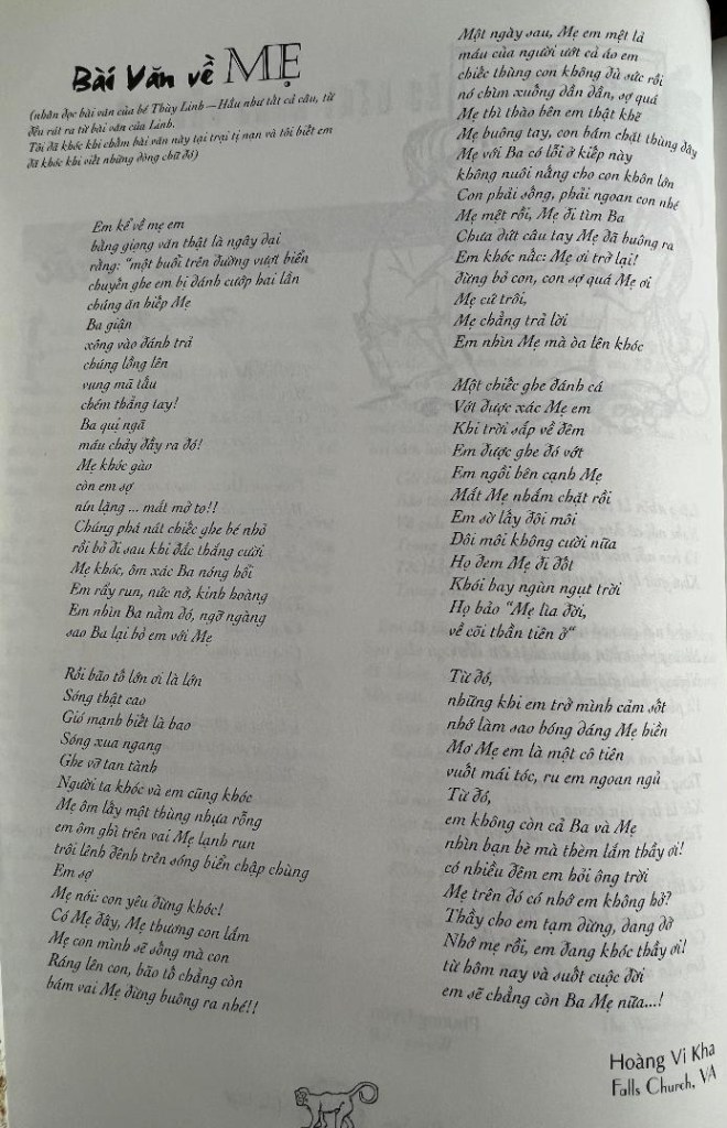 | CON CẦN MẸ, MẸ ƠI! (Viết cho cô bé Thuỳ Linh nhân đọc bài thơ “Bài văn về Mẹ” của tác giả Hoàng Vi Kha đăng trong đặc san Lửa Việt năm 2004” – xem nguyên văn bài thơ ở bên dưới ) “ ..Từ đó em không còn cả ba và mẹ Nhìn bạn bè mà thèm lắm, thầy ơi!” (Thơ Hoàng Vi Kha) Tôi đã khóc.. Những giọt nước mắt chảy ra Từ tấm lòng của một người chứng kiến bao dâu bể. Của cuộc đời vượt biển gian nan! Tôi đã khóc, mắt tôi đầy lệ Và nghe như .. ai bóp chặt tim mình! Lời thơ trẻ: “ Thầy cho em tạm dừng dang dở Nhớ Mẹ rồi, em đang khóc, thầy ơi..” Tôi muốn được bên em, giờ phút đó Để vỗ về, và để khóc cùng em. Giữa bao người sao chỉ một mình em? Với mơ ước nhỏ nhoi nhìn thấy Mẹ Tôi đã khóc khi nhìn ra biển cả Biển lạnh lùng ôm dấu những tình thân Biển hung hăng cướp mất những thâm tình Biển đen tối vùi đi bao mơ ước Tôi đã khóc cho em, từ trong biển Nhìn từng người thân thuộc bỏ em đi Này Cha, rồi Mẹ ..những người quen. Thân xác gởi theo lòng biển lạnh! Tôi đã khóc .. như bao đêm em khóc Khóc cho đời vong quốc, đổi tự do Tự do ở xa…Cướp biển lại ở gần Giữa biển cả, tiếng kêu trời … ….. Trời cao không thấu! Tôi đã khóc, cùng với em, tiễn biệt! Những thâm tình, ai níu giữ cho em? Tuổi còn thơ, em cần vòng tay mẹ Mẹ bỏ em rồi .. Xa giấc mơ êm! Em lại khóc cho cuộc đời côi cút Bởi vì ai, em mất mẹ mất cha? Bởi vì ai, triệu người bỏ ra đi Đem mạng sống làm ván bài: Thua-Được Em đã khóc khi nhìn thùng nhựa rỗng Nhớ mẹ em đêm giông tố kinh hoàng Lời oán thán, sao Trời không nghe thấy Để cho em, giờ côi cút hoang mang. Bài văn dở dang, đầu đề về Mẹ Làm sao em có thể viết cho tròn? Giữa cuộc đời, mẹ đã bỏ lại em Không tay ấm, không một lời an ủi Em ở đó, giữa tận cùng trơ trụi Giữa bơ vơ, giữa se sắt mỏi mòn Xác của mẹ đã theo dòng biển lớn Theo vết tro tàn, phai dấu môi son Chuyện đã qua đi, sao trong em vẫn nhớ Vẫn nhớ lần vượt biển mất mẹ, cha! Vẫn còn nghe tiếng biển rú kinh hoàng Vẫn sợ hãi mỗi đêm … …… Khi mình em thức giấc! Em ghét biển, ghét màu xanh nước biển Biển không ngoan cũng chẳng giống mẹ hiền Biển và họ (Những tên cướp biển) Gieo đau thương tang tóc, chẳng động lòng. Em đứng đó, trơ trơ … nhìn biển cả Biển vẫn mênh mông, vẫn tiếng sóng gào Tiếng sóng biển hay sóng lòng em gọi “ Mẹ hãy trở về .. Con cần Mẹ, Mẹ ơi …!” Môi Tím (Thái Mộng Trinh) December 2004 |
