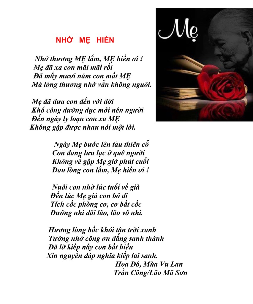 | Bó Hồng Tặng Mẹ Con cung kính. Bó hồng riêng tặng mẹ Cả tình thương, sâu thẳm của tâm hồn Mẹ là suối nguồn, dòng chảy tinh khiết Nuôi con một đời, đến tuổi lớn khôn. Dâng lên Mẹ ngàn đóa hồng thắm đỏ Dòng máu hồng. Mẹ trao tặng cho con Ngày lễ Mẹ, bồi hồi thêm nỗi nhớ Nhớ ơn người, nuôi nấng thuở măng non. Tình yêu mẹ, dạt dào như sóng vỗ Vỗ giấc bình yên, chăm sóc đời con Viết về Mẹ, lời thơ đầy nước mắt Vào nỗi buồn, tuổi xuân đã hao mòn. Công ơn Mẹ, sánh núi cao, biển cả Thấu trời xanh. Thượng Đế phải ngậm ngùi Mẹ là thảo nguyên bao la bát ngát Dòng suối nguồn, tuôn chảy những ngọt bùi. Mẹ trên cao, như sao sáng trên trời Mẹ hiền từ, ôm con cả một đời Lời nguyện cầu, con ước mơ về mẹ Tiếng mẹ dịu dàng, nhớ mãi không ngơi. Tình yêu của mẹ bao la biết mấy Sáng như mặt trời, đẹp như mây bay Ai! Còn Mẹ, đừng làm Mẹ bật khóc Đừng để buồn, giọt lệ ướt trên tay. Xin gửi đến Mẹ, ngàn đóa hoa hồng Thấm sương long lanh, ướt cả nỗi lòng Lời nghẹn ngào, bài thơ ngày lễ mẹ Buộc vào hoa, gửi mẹ những hoài mong. Lê Tuấn Vần thơ tưởng nhớ đến Mẹ. Gửi đến Mẹ ngàn đóa hoa hồng |