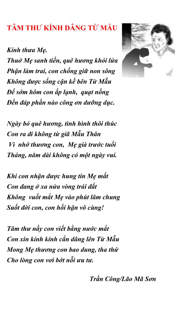 | NHỚ MẸ Tôi nhớ mẹ tôi nhớ suốt đời Khi còn bé tí lúc nằm nôi Trưa hè nằm võng, đêm trăng sáng Nét mặt mẹ in, tiếng mẹ cười. * Rồi lúc lớn hơn, tập con bò, Tập đứng tập đi, tập lò dò Chỉ e con té, tay dang rộng Đỡ vội con vào, miệng xuýt xoa … * Con lớn hơn lên tập đánh vần Dưới đèn bố mẹ tựa tình nhân Cả hai ngày ấy chừng đôi tám Mẹ đẹp như trăng đúng tối rằm, * Hạnh phúc tràn lan khắp cả nhà, Nụ cười con tựa Mụ thêu hoa, Rồi con thêm lớn đi trường học, Mẹ bận đón đưa thật đúng giờ, * Đến khi vừa đúng con lên bảy, Chiến tranh Việt Pháp bỗng tràn về Đạn bom tan nát không sao sống Bố mẹ đành đi khỏi vùng Tề! * Bỏ làng bỏ xóm bỏ Quê Hương Con nhỏ chờ cơm ?! – Sao có cơm Bữa đói bữa no, lo đạn giặc Máy bay phóng pháo dập từng cơn * Nay ngày Lễ Mẹ coi tin tức Ngắm cảnh mình xưa hệt Ukraine ! Ôi mẹ ! Thân cò nay đã khuất . Con thắp nén nhang vái mẹ hiền . * Nước mắt con nhoà theo nhang khói. Bao điều muốn nói, Mẹ giờ đâu ?! Lạy phật độ trì nơi tiên cảnh Cho linh hồn mẹ hết u sầu ! THƯ KHANH |