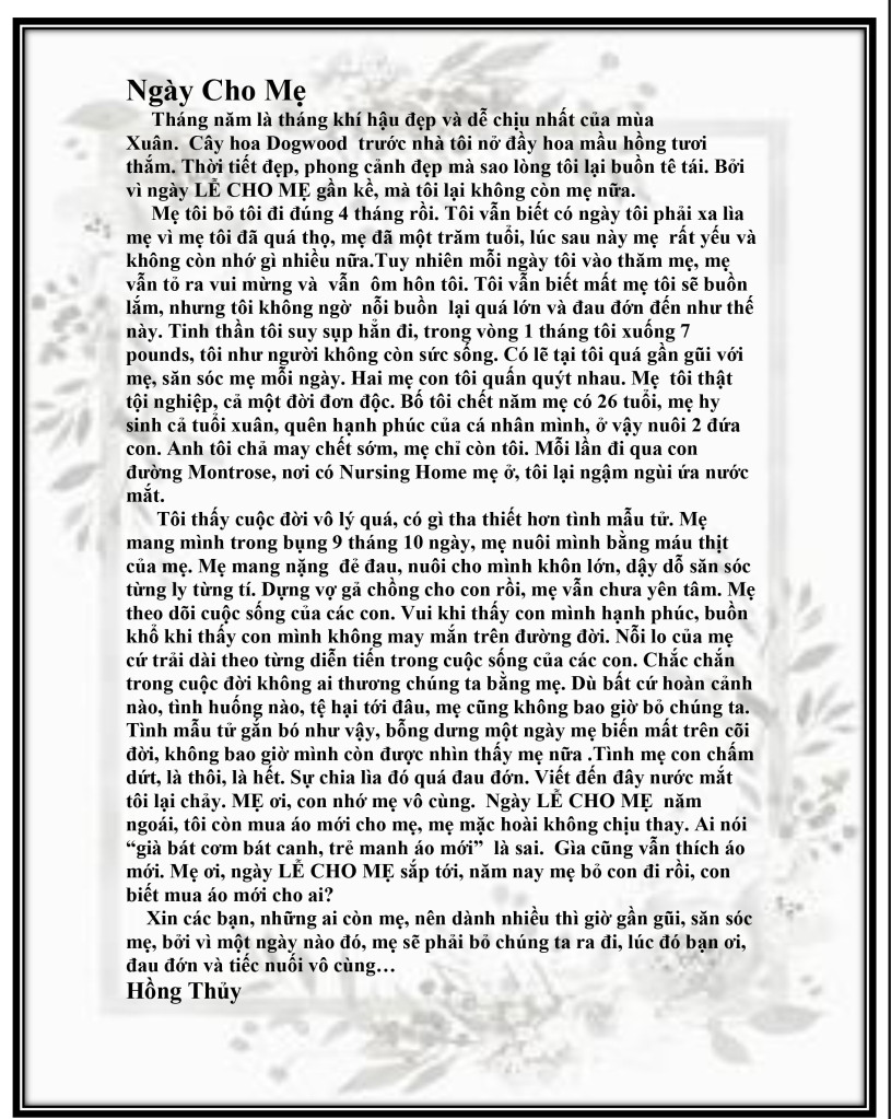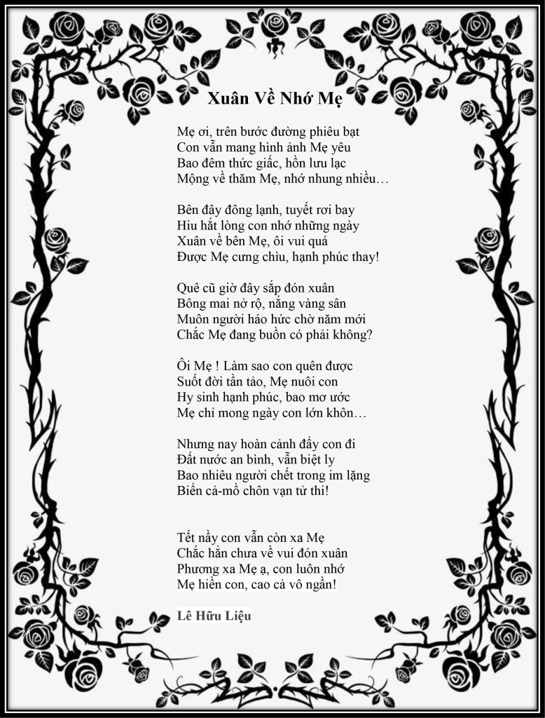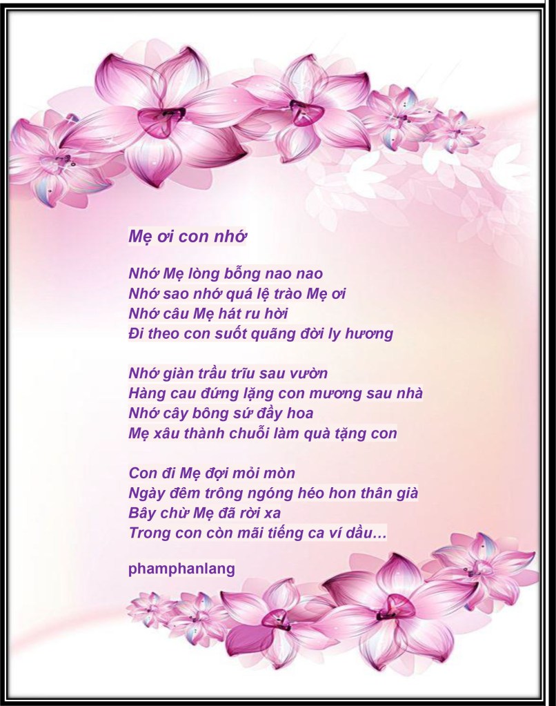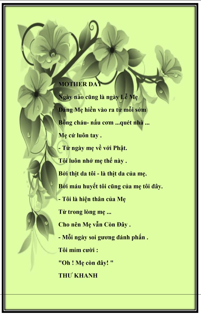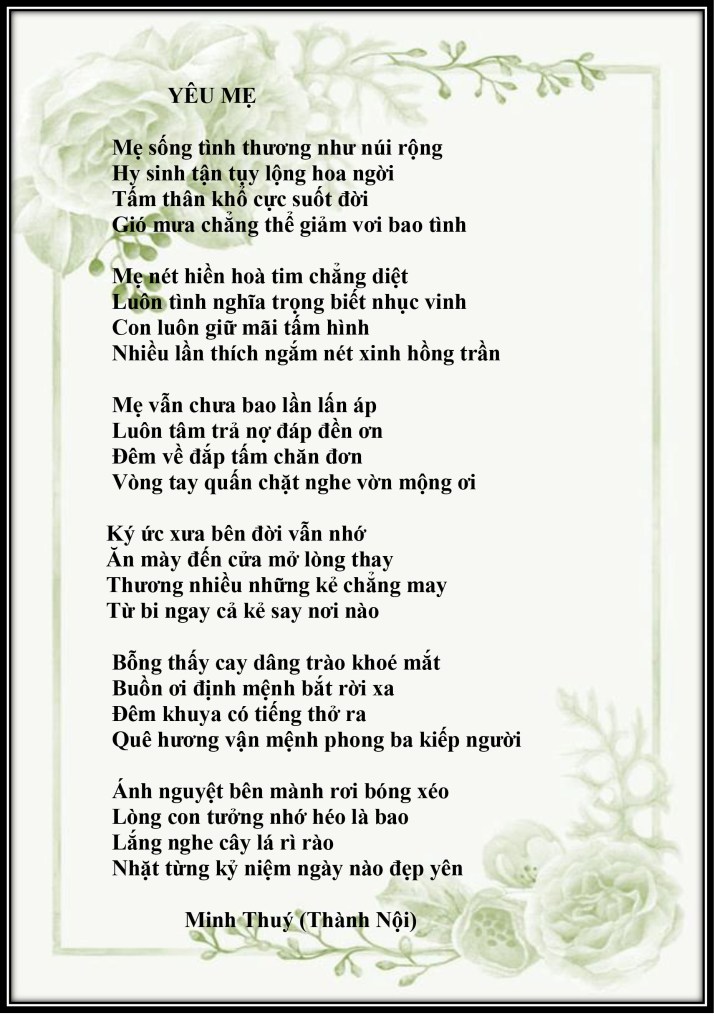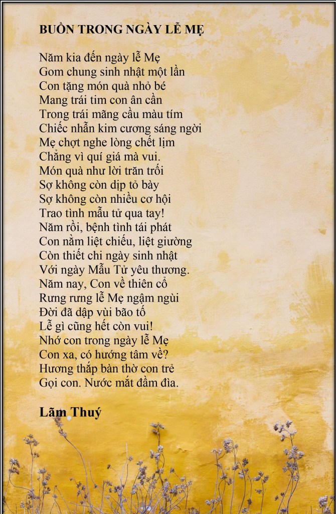 | NGÀY LỄ MẸ Vất vả không nề cực nhọc thân Thương con lặn lội trải trăm lần Ngày đông hứng gió môi khô nhạt Tháng hạ phơi sương tóc bạc dần Bỏ nước ra đi sầu ngập đọng Rời làng trốn chạy khổ đầy dâng Hôm nay Lễ Mẹ buồn tê tái Thắp nén hương yêu buốt cõi phần Minh Thuý(Thành Nội) |