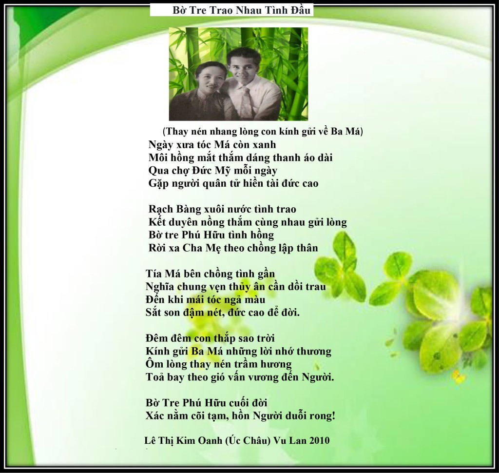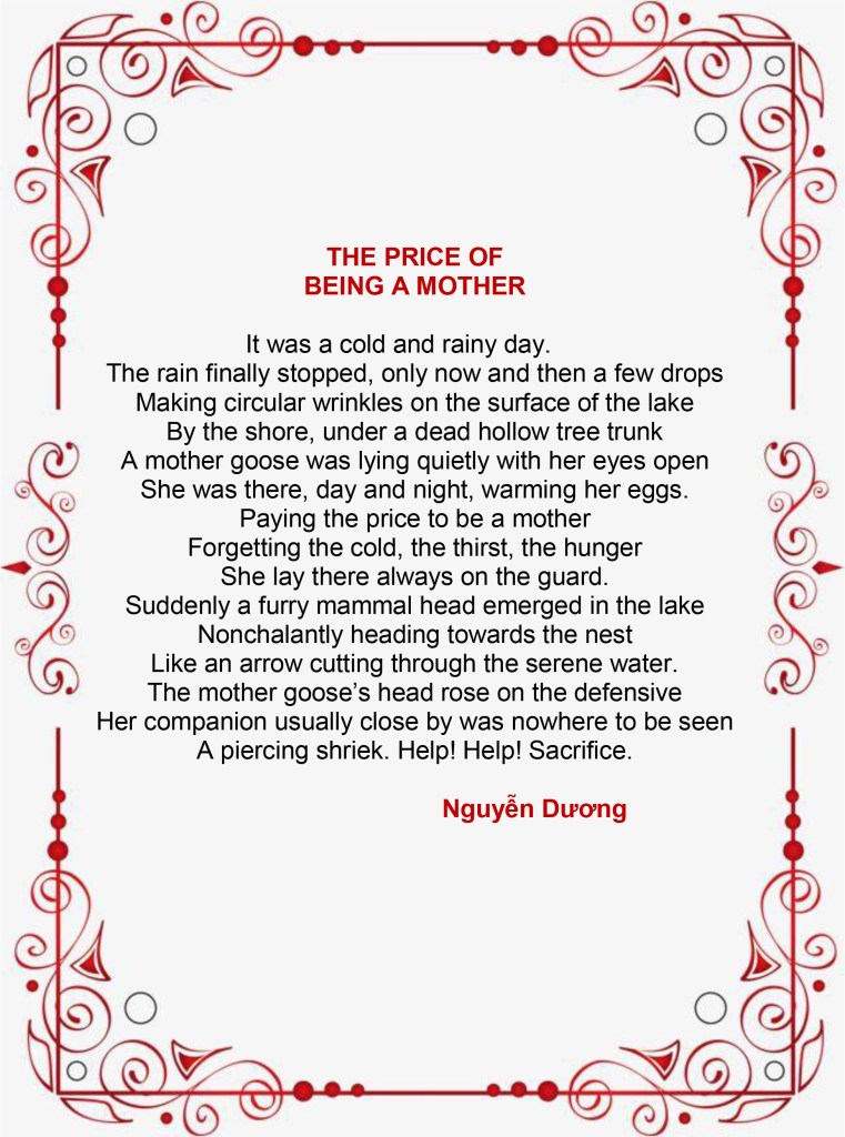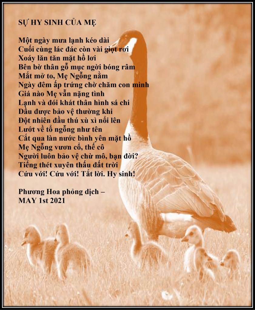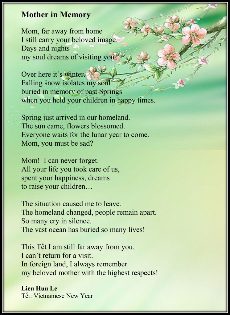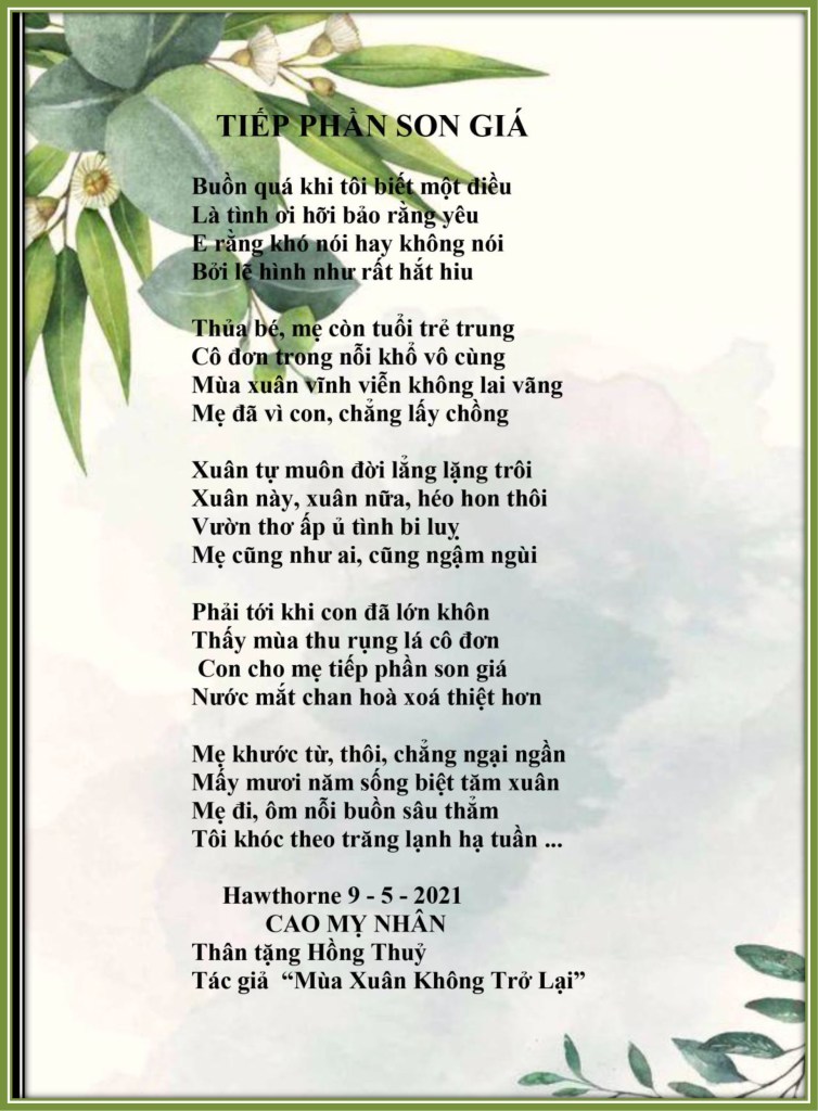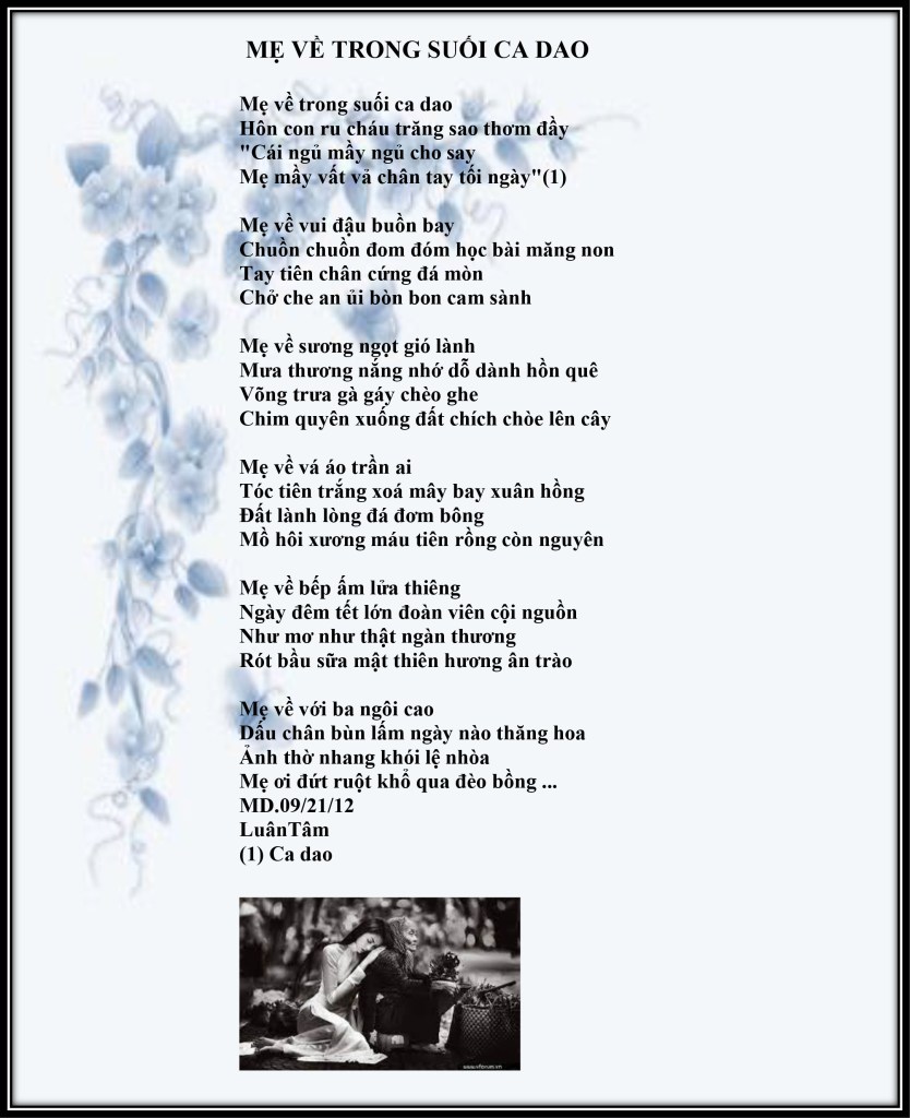 | NGÀY LỄ MẸ Vất vả không nề cực nhọc thân Thương con lặn lội trải trăm lần Ngày đông hứng gió môi khô nhạt Tháng hạ phơi sương tóc bạc dần Bỏ nước ra đi sầu ngập đọng Rời làng trốn chạy khổ đầy dâng Hôm nay Lễ Mẹ buồn tê tái Thắp nén hương yêu buốt cõi phần Minh Thuý(Thành Nội) |