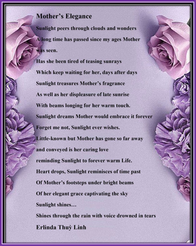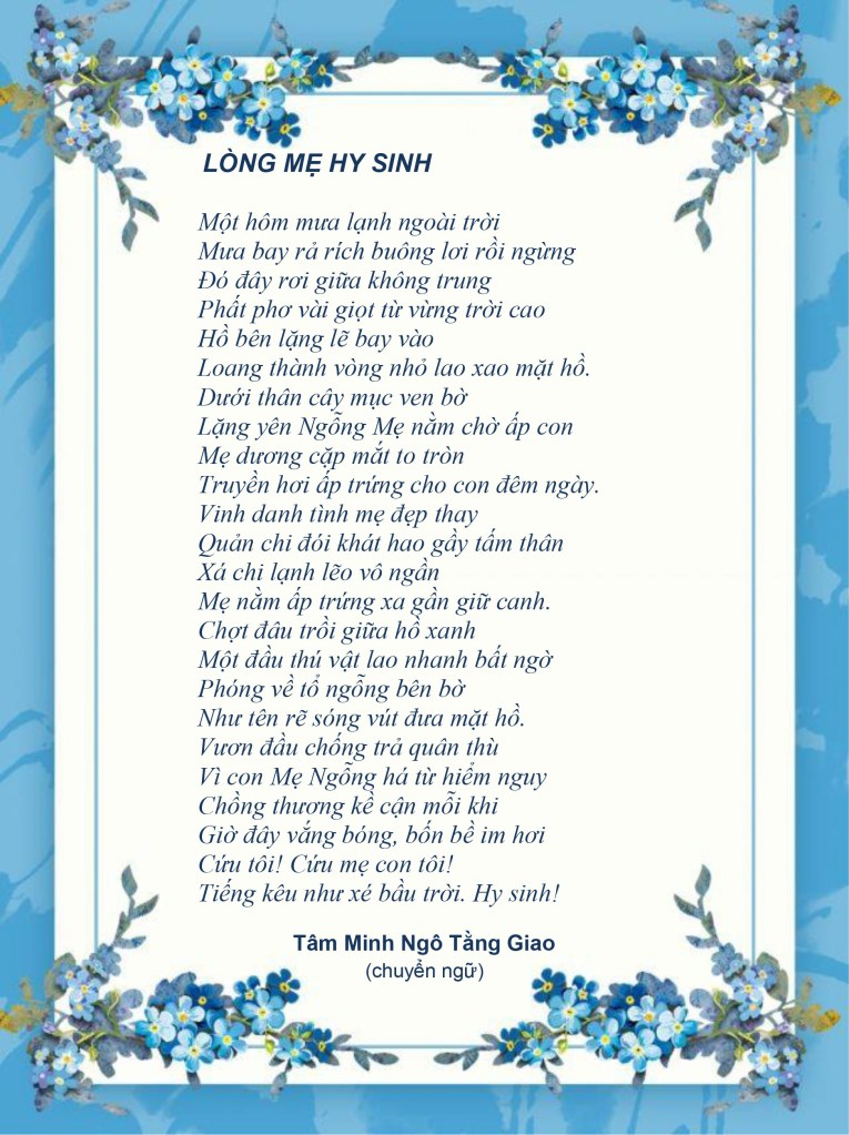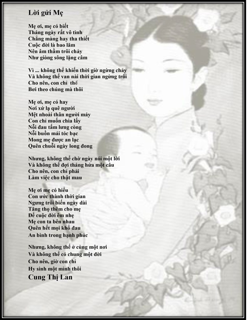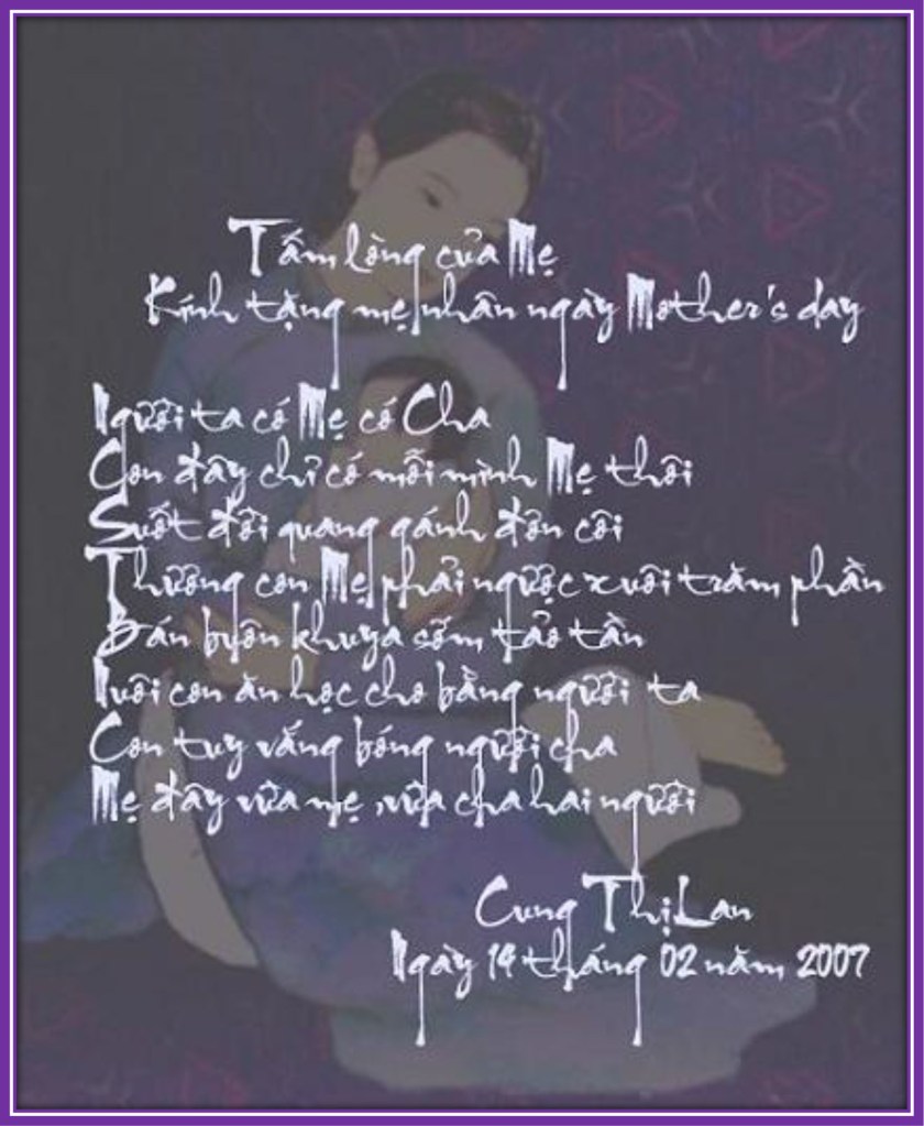 | GỬI MẸ CỦA CON Vài hàng kính gửi Mẹ yêu Mỗi khi con nói Mẹ chiều Mẹ nghe Mẹ là người bạn cận kề, Suối nguồn tình Mẹ không hề cạn vơi. Đôi khi lòng Mẹ tơi bời, Thâm trầm tình Mẹ không lời thốt ra. Mẹ thời trẻ mãi không già, Tình con dâng Mẹ chan hòa ngàn trang. Trong con tình cảm thênh thang Mẹ thời khai mở nhẹ nhàng cảm thông, Cho dù biển rộng mênh mông Con bơi tìm Mẹ mà không ngại ngùng. Con yêu Mẹ, yêu vô cùng Con luôn kiêu hãnh nói sung sướng rằng: “Mẹ vĩ đại không ai bằng Mẹ thời tuyệt hảo, vĩnh hằng, Mẹ ơi!” Mẹ hy sinh cả một đời, Bàn tay xoa dịu con thời khó quên. Mẹ coi con ở cạnh bên Mãi còn bé bỏng lành hiền thơ ngây, Con dù lười biếng đôi ngày Mẹ luôn thương mến la rầy gì đâu. Con luôn thành thật hàng đầu, Noi gương Mẹ quý trước sau giữ lời. Mẹ thường cầu nguyện đất trời Thiết tha, nồng thắm, muôn đời thành tâm. Chính bàn tay Mẹ dự phần Nuôi con lớn dậy khôn ngoan nên người Dù con Mẹ đã có thời Bước chân lầm lạc rong chơi lỡ làng. Mẹ ơi con muốn thưa rằng Khó ai mà lại sánh ngang Mẹ hiền, Con ân hận, con muộn phiền Nếu “Ngày Hiền Mẫu” lại quên năm này. Con mong ôm Mẹ trong tay Thốt lời âu yếm giọng đầy tri ân Vì rằng Mẹ đã bao lần Yêu con, không chấp lỡ lầm của con. Và lòng mẹ đã chẳng buồn Cảm thông chia xẻ chuyện con hoang đàng, Nụ cười Mẹ mãi rỡ ràng Phô ra nét đẹp huy hoàng khắc sâu Trong con ấp ủ dài lâu Tận cùng tâm khảm rạng màu thương yêu. Mẹ là tặng phẩm mỹ miều Trời cao ban phát với nhiều hồng ân. Mẹ là tiên nữ giáng trần Nữ hoàng lộng lẫy trong tầm mắt con, Con yêu Mẹ, yêu thật lòng Tình con dâng Mẹ mãi không phai tàn! Con yêu Mẹ nhất trần gian Nhân “Ngày Hiền Mẫu” ngập tràn niềm vui Con ghi ơn Mẹ suốt đời Được làm con Mẹ tuyệt vời biết bao. Những điều Mẹ ước từ lâu Bao ngày chất chứa thầm sâu trong lòng Con cầu chúc, con ước mong Năm nay Mẹ sẽ đạt xong vẹn toàn, Tình gây cảm hứng dâng tràn Không bao giờ tắt, ngày càng đẹp thêm Hướng đàn con nối gót liền Theo đường rực rỡ dấu in chân tình. Mẹ là kho báu thiên đình Trời cao ban xuống cho mình con thôi! Tâm Minh Ngô Tằng Giao (chuyển ngữ) ![]() |