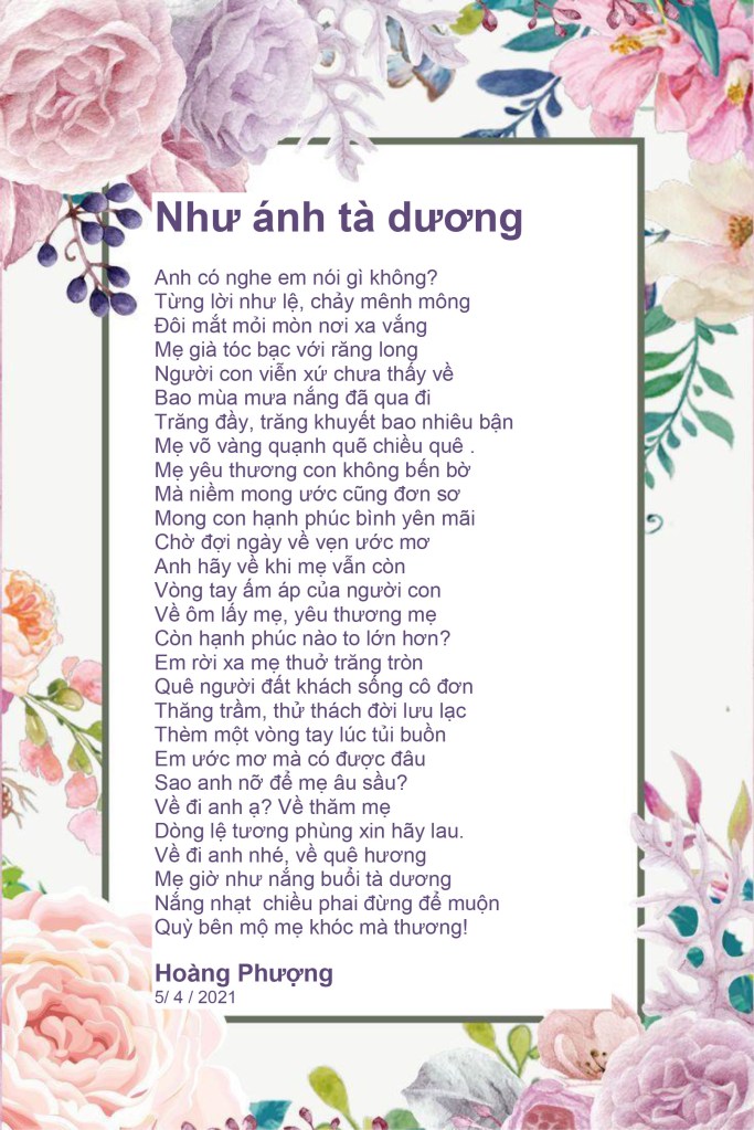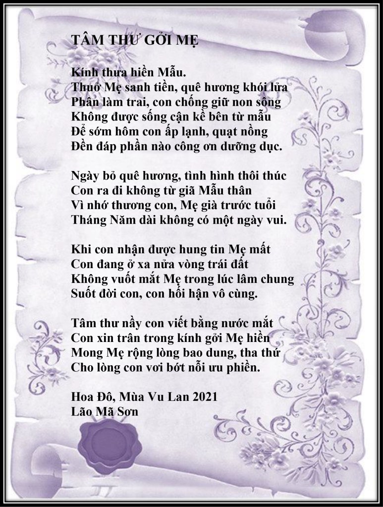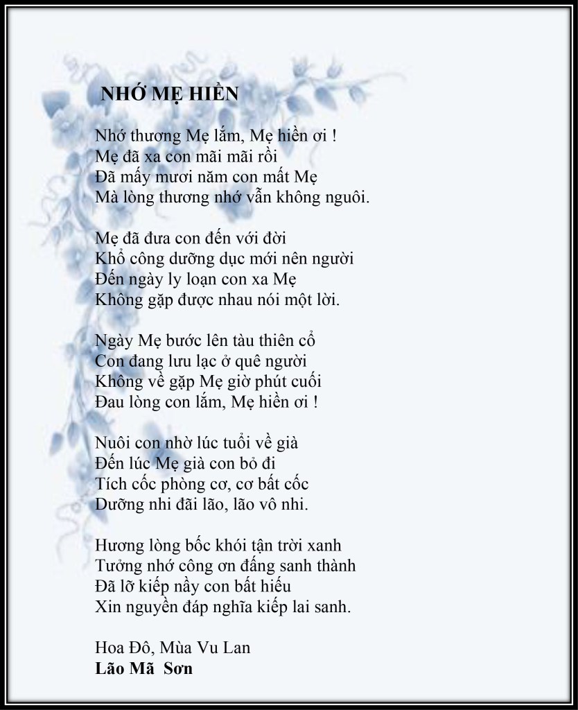| NGƯỜI LÍNH TRẺ KHÓC MẸ Thương người lính trẻ trấn đồn xa Chống giặc xâm lăng giữ nước nhà Trên đôi vai, tình nhà, nợ nước Phiên gác đêm mưa nhớ Mẹ già. Mẹ ở hậu phương thương con trẻ Đêm nghe tiếng súng vọng từ xa Lâm râm khấn Phật Trời phù hộ Con trẻ bình an sớm về nhà. Tàn cuộc chiến, con về với Mẹ Về đến nơi, Mẹ đã không còn Khóc mẹ bên mồ chưa xanh cỏ Mẹ ơi, sao Mẹ chẳng chờ con ! Trời cao, đất rộng, biển sâu Con thương nhớ Mẹ biết đâu mà tìm. Hoa Đô, Ngày Từ Mẩu (Mother’s Day 2021) Lão Mã Sơn |