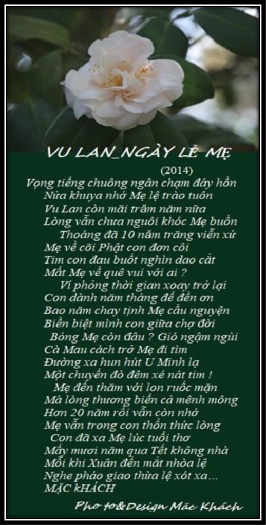 | NGÀN THU VĨNH BIỆT Kính dâng linh hồn Mẹ Pháp danh CHÂU NGỌC Từ biệt tử sinh lòng thanh thản Mẹ về cõi Phật ánh hào quang Mẹ ơi Mẹ _ NGÀN THU VĨNH BIỆT Lòng con hoang vắng một màu tang ! Đường xa vạn dặm về thăm Mẹ Niềm vui chưa trọn chịu áo Tang Hỏi có đau thương lòng nức nở Ơn Mẹ chưa đền tim xốn xang ! Con chết lặng quỳ bên thân xác Xót xa lòng quấn lấy khăn Tang Mẹ ơi Mẹ từ đây vắng bóng Nhớ Mẹ nhiều…mỗi gió Thu sang Sáng nay tiễn biệt Trời im vắng Sông nước buồn tênh lá úa sầu Bước lui…trĩu nặng hồn con nhớ Bóng Mẹ xa dần…tim nhói đau ! Chiều phủ hòang hôn quỳ bên mộ Bịn rịn mây bay cảnh sắc buồn Tim con tan nát như ai giẫm Cố nén lòng mà lệ vẫn tuôn… Bao lời Mẹ dạy con ghi nhớ Cát bụi phù vân Sắc Sắc Không Chấp tay cúi đầu con khấn nguyện Mẹ về Cực lạc cõi Hư Không Ngày mai xứ Người con trở lại Mộ Mẹ bên sông lệ chảy dài Bước Lưu vong con mang Tang Mẹ Mà lòng khóc ngất…tiếng bi ai ! MẶC KHÁCH |