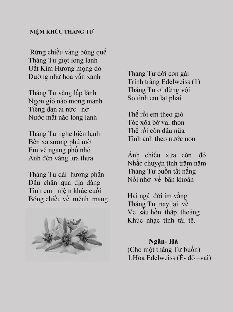 | CHỜ EM ( Gởi người em đã khuất, năm thứ hai ) Anh đợi chiều nay em sẽ vê Đợi hoàng hôn rũ dưới chân đê. Nhớ tà áo lộng bay trong gió Cuốn cả hồn anh với đam mê. Em ở nơi mô, anh ở đây Sóng reo tình mộng vẫn còn đầy. Em xa xăm quá ngàn thương nhớ Anh vẫn nơi này cuối chân mây. Một cõi thu xưa lá ngất ngây Chờ em trong dáng bóng chim bay. Chim về bên ấy nghe ta nhắn Anh vẫn chờ em với lòng này. Ai rủ thời gian chắp cánh bay Hai lần thu đã với heo may Tuổi xuân vàng úa theo năm tháng. Mà nghe sỏi đá khóc từng ngày. Ngân – Hà |