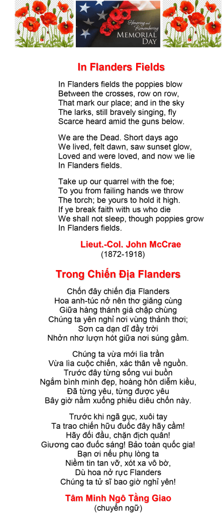 | Trong Chiến Địa Flanders Chốn đây chiến địa Flanders Hoa anh-túc nở nên thơ giăng cùng Giữa hàng thánh giá chập chùng Chúng ta yên nghỉ nơi vùng thảnh thơi; Sơn ca dạn dĩ đầy trời Nhởn nhơ lượn hót giữa nơi súng gầm. Chúng ta vừa mới lìa trần Vừa lìa cuộc chiến, xác thân về nguồn. Trước đây từng sống vui buồn Ngắm bình minh đẹp, hoàng hôn diễm kiều, Đã từng yêu, từng được yêu Bây giờ nằm xuống phiêu diêu chốn này. Trước khi ngã gục, xuôi tay Ta trao chiến hữu đuốc đây hãy cầm! Hãy đối đầu, chặn địch quân! Giương cao đuốc sáng! Bảo toàn quốc gia! Bạn ơi nếu phụ lòng ta Niềm tin tan vỡ, xót xa vô bờ, Dù hoa nở rực Flanders Chúng ta tử sĩ bao giờ nghỉ yên! Ngô Tằng Giao chuyển ngữ |