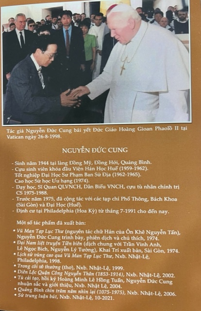 | SƠ LƯỢC TIỂU SỬ NGUYỄN ĐỨC CUNG –Sinh năm 1944 tại làng Đồng Mỹ, thành phố Đồng Hới, tỉnh Quảng Bình -Cựu sinh viên khóa đầu Viện Hán Học Huế (1959-1962) -Tốt nghiệp Đại Học Sư Phạm Ban Sử Địa (1962-1965) -Cử Nhân Giáo Khoa Sử Học tại Trường Đại Học Văn Khoa Huế (1965). -Cao Học Sử Học Ưu Hạng (1974) tại Trường Đại Học Văn Khoa Huế. -Giáo Sư Trường Trung Học Trần Quý Cáp Hội An, Quảng Nam, Sĩ Quan QLVNCH, Dân Biểu VNCH đơn vị Tỉnh Quảng Nam, Cựu tù nhân chính trị Cộng Sản 1975-1988. -Trước năm 1975, đã cộng tác với các Tạp chí Phổ Thông, Bách Khoa (Sài Gòn) và Tạp chí Đại Học, cơ quan nghiên cứu của Viện Đại Học Huế (1957-1975) -Định cư tại Philadelphia, Hoa Kỳ từ tháng 7-1991 cho đến nay. |