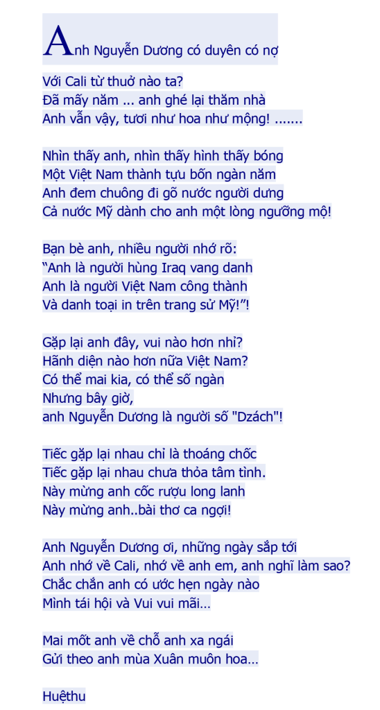 | Thêm tác phẩm và hình ảnh của tác giả Nguyễn Dương trong trang website VB Vùng Đông Bắc Hoa Kỳ (Vui lòng bấm vào hình hay link bên dưới) ![]() NGUYỄN DƯƠNG |