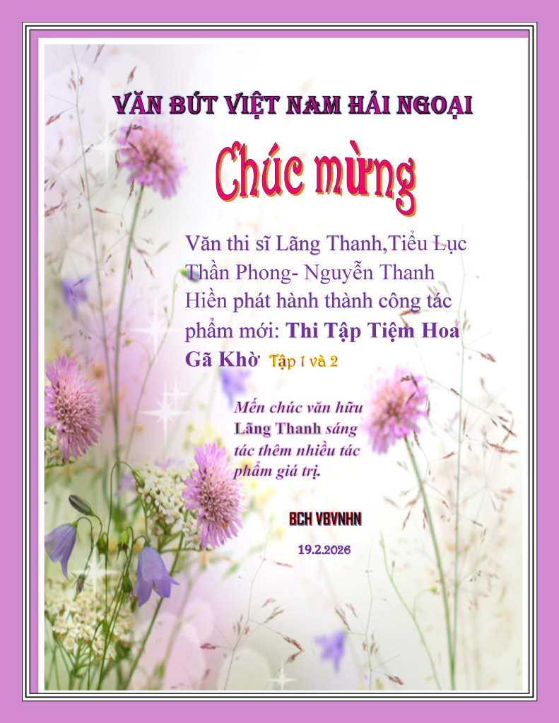 | Kính gửi quý văn thi hữu VBVNHN, Y Thy Võ Phú xin được trân trọng giới thiệu đến quý văn thi hữu thi phẩm mới nhất của thi sĩ Lãng Thanh, tức văn thi sĩ Tiểu Lục Thần Phong (một thành viên gắn bó của VBVNHN, thuộc Văn Bút vùng Đông Bắc Hoa Kỳ.) Với tinh thần sáng tác bền bỉ và niềm say mê chữ nghĩa hiếm thấy, thi hữu Lãng Thanh viết không ngừng nghỉ, như mạch nguồn tuôn chảy, như thác đổ mưa qua…. Trong những ngày đầu năm 2026, anh đã gửi đến Võ Phú bản thảo thi tập Tiệm Hoa Gã Khờ, nhờ hỗ trợ phần layout và in ấn. Khi nhận được bản thảo dày hơn 600 trang, với hàng trăm bài thơ được viết trong nhiều giai đoạn khác nhau, Võ Phú đã mạo muội đề nghị anh nên tách tập thơ này thành hai cuốn riêng biệt, thay vì in một tập thơ quá dày, để mỗi tập có được không gian (thẩm mỹ và nhịp đọc khoan thai) hơn cho độc giả. Hôm nay, Y Thy Võ Phú xin được hân hạnh giới thiệu đến quý văn thi hữu thi tập Tiệm Hoa Gã Khờ I; tập thơ đầu tiên trong bộ Tiệm Hoa Gã Khờ. Tập thơ gồm 309 trang, khổ giấy 6×9 (tương đương khổ tạp chí VBMD), được in màu, trình bày trang nhã và lịch thiệp, phù hợp với tinh thần thơ cũng như mỹ cảm của tác giả. Tiệm Hoa Gã Khờ I không chỉ là một tập hợp thơ, mà còn là một không gian chữ nghĩa riêng tư, nơi cảm xúc, suy tưởng, cô đơn, yêu thương và hoài niệm cùng tồn tại, được viết ra bằng một giọng thơ chân thành, đôi khi hồn nhiên, đôi khi gai góc, nhưng luôn nhất quán với nội tâm người viết. Xin kính mời quý văn thi hữu dành chút thời gian đọc lời tựa đính kèm, cũng như ghé thăm đường link dẫn đến thi tập để cùng chia sẻ, cảm nhận và nâng đỡ tiếng nói thơ ca của một người viết miệt mài trong cộng đồng chúng ta. Xin trân trọng giới thiệu và kính chúc quý văn thi hữu nhiều an lành trong năm mới. Trân trọng, Y Thy Võ Phú |
