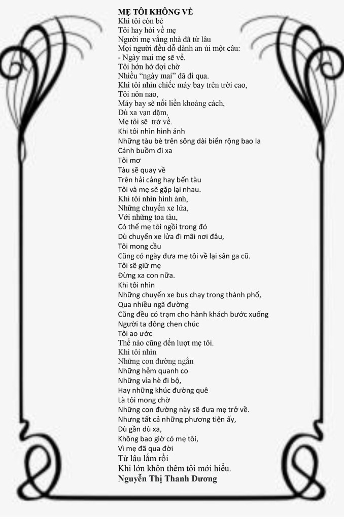 | Truyện ngắn của Văn thi sĩ Nguyễn Thị Thanh Dương 1. VIỆT KIỀU VỀ QUÊ CƯỚI VỢ 2. NÉT ĐẸP THỜI GIAN 3. BÓ HOA KHÔNG NGƯỜI GỞI 4. NHỮNG ÂN NHÂN DỄ THƯƠNG 5. VỢ CHỒNG NHƯ KHÁCH KHỨA 6. NGƯỜI MẸ KHÔNG QUEN BIẾT 7. Kỷ NIỆM HỌC TRÒ 8. HẠT BỤI VÔ TÌNH 9. Ngã Tư Thân Yêu 10.GÀ TÂY 3 MÓN 11.Ngày 30 Tết 12. MÙA XUÂN NÀY SẼ VUI 13.CHỈ LÀ HÀNG XÓM 14. Số Sát Phu 15. ĐI BỆNH VIỆN PARKLAND 16.CHÀNG TRAI NĂM XƯA… 17. Yêu Lính 18.NHÀ CON MỘT 19. XỚN XÁC TUỔI GIÀ 20.NÓNG BỎNG NHỮNG NGÀY HÈ 21. Nho Chua Đầu Mùa 22.HÀNH LÝ TRỞ VỀ 23. CHIẾC VÁY NGÀY TẾT 24. BAO GIỜ CHÁU TÔI LẤY CHỒNG? 25. Anh Yêu Ai? 26.TỔ HỢP MÌ SỢI 27. NẾU TÌNH CỜ GẶP LẠI 28. MẤT TÍCH 29. Mẹ Mãi Là Tổ Ấm 30.BETSY RA TRƯỜNG 31.Anh Đi Vào Mùa Thu 32. NGƯỜI MỸ “KHỜ” 33.ĐÁM CƯỚI CỦA AI? 34.Bữa Tiệc Giáng Sinh Nhiệm Màu 35. LẤY VỢ THỜI BAO CẤP 36.HỌP TỔ DÂN PHỐ 37. Tưng Bừng July 4th 38. Đừng yêu người làm thơ – Nguyễn thị Thanh Dương |