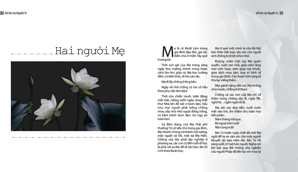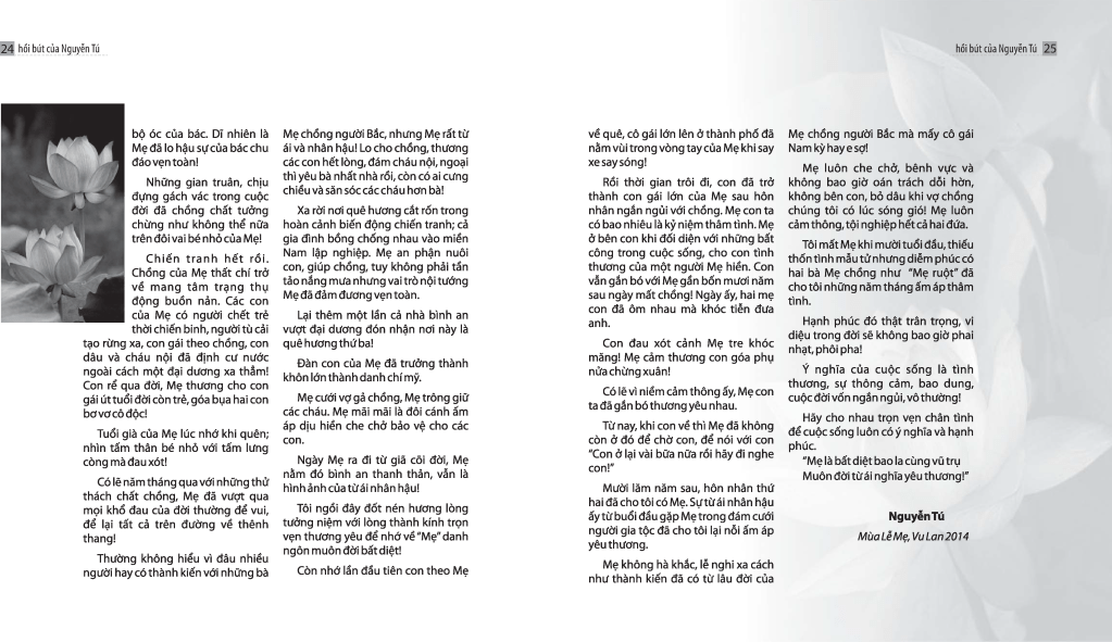 | Con nợ của Ba một cánh hồng Ba kính yêu muôn đời của con ơi! Ba đã ra đi vĩnh viễn rồi! Ba nằm xuống trong lúc con ở thật xa, xa đến không thể về để nhìn ba một lần cuối cùng. Đeo lên đầu một mảnh khăn tang và đưa tiễn ba một đoạn cuối cùng. Con nợ ba một cành hoa hồng yêu thương bỏ vào huyệt mộ. Ba ơi! Tha tội cho con! Từ rất lâu cha con mình đã có một tình cảm sâu sắc. Lúc còn bé ba đã cưng con nhất nhà. Mọi việc lớn nhỏ đều giao phó hết cho con, không phải để “làm” mà chỉ để “giám sát”. Ba hay nói đùa: “Có con gái cưng của tao ở đây nó báo cáo hết.” Ba là một người thợ máy rất giỏi. Lúc tụi con còn nhỏ xíu ba đã làm chủ một tiệm sửa xe rồi. Con nghiễm nhiên thành cô chủ nhỏ trong garage. Con nhớ tiệm của mình có nhiều thợ và rất đông khách sửa xe. Lúc nào cũng bận rộn. Lúc nào cũng có ca làm đêm. Nhớ những ngọn đèn măng xông sáng rực và không khí nhộn nhịp trong xưởng. Con thích nhất là được thức khuya nhất định chờ để được ăn chè, hay ăn cháo rồi mới chịu đi ngủ. Lúc ấy con còn nhỏ lắm, chưa đủ để nhớ tất cả mọi chuyện. Chỉ biết là con được sống sung sướng lắm, có đầy đủ mọi thứ mà các bạn cùng tuổi phải thèm thuồng. Nhà mình ở Sài Gòn có garage “Lê Nguyễn”, rồi ở Đà Lạt cũng có tiệm sửa xe nổi tiếng của ba. Ba có nhiều học trò và dạy rất tận tâm. Đến nay cũng còn vài người ở Sài Gòn thành công rất lớn và là những ông chủ giàu có nổi tiếng. Con vẫn nhớ những kỷ niệm sâu sắc nhất cho đến bây giờ. Lúc nhỏ con thích nhất là được dọn nhà đi ở chỗ mới, vì vậy mà mấy lần thất vọng quá chừng vì phải trở về nhà khi nước rút hết sau những trận mưa lũ Đà Lạt. Có lần garage của mình bị một nạn lớn vì các ông “Mẹ sóc” ở làng bên đến nằm vạ, kiện cáo vì mình không hàn được cái phèn la của họ mà còn làm thủng lớn hơn. Ba thương lượng mà họ không chịu. Họ nói cái phèn la đó đã rất lâu năm, giá trị lớn lắm vì họ đã tế biết bao nhiêu là bò, trâu, heo, gà. Phèn la của họ là vô giá! Con nhớ họ làm dữ lắm. Cũng vì việc đó mà ba phải bỏ ăn, bỏ ngủ để giải quyết. Họ thấy mình có garage, có máy hàn nên đến nhờ không ngờ bị phiền phức đến như vậy! Con sợ lắm. Nhất là thấy mấy người Thượng ca hát cúng tế cái phèn la. Lúc ở Đà Lạt, con suýt chết đuối vì mê bắt con rùa vàng, cái con nhỏ xíu biết bay mà mỗi lần nó đậu lại xếp hết cánh vào giống y hệt như con rùa nhỏ thật dễ thương. Con vì với cành cây bắt nó mà hụt chân lăn xuống suối, may mà lúc ấy suối thật cạn. Ba đã hốt hoảng hô hào thợ thuyền bỏ hết việc để cứu con và lo lắng săn sóc hết lòng! Rồi nhà mình cuối cùng lại dọn về Sàigòn. Cứ mỗi lần đi xa là cái màn say xe lại tái diễn, xe bị “rửa” dài dài. Nhà mình là garage, có xe hơi mà con là đứa thích đi xích lô nhất. Ba hay nói đùa “Tội nghiệp số con tôi khổ”. Ba ơi! Bây giờ con đâu có bị say xe nữa, con lái xe hằng ngày. Những lúc tư tưởng trải dài trên đường, con nhớ ba lắm. Mấy mươi năm rồi, ba năm nay đã già nhưng vẫn còn cứng cáp lắm. Ngày nào cũng y phục chỉnh tề thả bộ đi thăm con cháu và bà con trong sớm mà! Sao lại bất ngờ nằm xuống như vậy?!… Nếu ba không bị té và không vì khó chịu mà cắt bỏ mấy cái băng bột ra thì đau đến nỗi! Má mất năm 1960. Lúc ấy ba đã ra Ban Mê Thuột để lập nghiệp. Năm 1967 con lấy chồng. Ba cũng không về được để mừng cho con. Chỉ có di Út dẫn Sơn về. Đứa em út của con theo ba mấy năm nay ở trên đó. Sau đám cưới độ gần tết, em con năm nỉ xin hết lời để được ở ở lại Sàigòn ăn Tết mà không được; dì Út nhất định dẫn em con về vì sợ ba rầy. Sơn về lại Ban Mê thuột và chết ngay mùng một Tết Mậu Thân! Biến loạn, thất lạc tin tức. Hơn nửa năm sau Ba về Sàigòn con mới hay em con đã chết! Lòng con đau như cắt. Em đã van xin ở lại mà không được, lúc ấy ba như không còn sinh lực: gầy ốm đau khổ tận cùng. Nghe kể lại ba đã chở xác em đi mấy ngày đêm trong biến loạn và nằm ở ngoài mộ với em ròng rã triền miên. Ba cưng nó lắm. Ba cưng nó lắm. Con nhớ lúc còn ở Sàigòn, mỗi lần ba về thăm, em con mừng lắm, lúc đó nó còn nói đớt và luôn miệng khoe với bạn bè: “Ba tao về, tao như rồng lên mây”. Con đã đặt tấm ảnh của ba trên bàn thờ bên cạnh má và Sơn, ảnh của Sơn trẻ lắm, em ra đi lúc tuổi mười ba! Khi ba và má con chung sống ba có một người con trai lớn hơn con vài tuổi. Anh ấy đã cùng con trải qua quảng đời thơ ấu cùng nhau, dù là không ruột thịt nhưng anh em con thương nhau lắm. Má cũng đùm bọc anh như con đẻ. Lúc thanh niên, anh ấy có lúc bị cám dỗ hư hỏng vì phong trào du đãng Sàigòn thời ấy hay bỏ nhà lêu lỏng; con còn nhỏ mà lo cho anh dữ lắm. Sợ anh bị đói khổ ngoài đường . Mỗi khi ra ngoài đường con chứng kiến cảnh tha