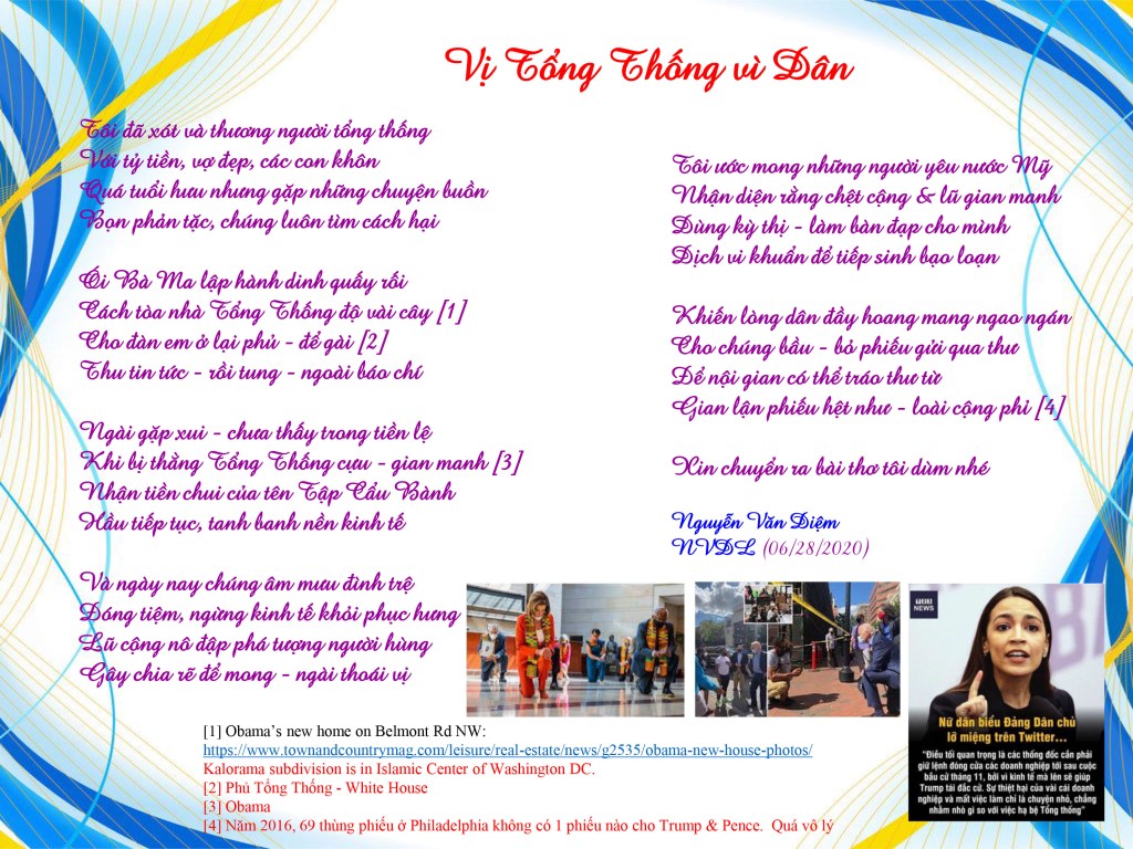 | Mẹ Tôi Mẹ tôi quê ở Bắc Ninh Vùng quê nổi tiếng hữu tình nên thơ Giống người tôi thích văn thơ Vần thơ lục bát câu hò à ơi Mẹ tôi lúc tuổi đôi mươi Tảo tần buôn bán để nuôi gia đình Một tay xây dựng cơ dinh Lập ngôi nhà gạch trước đình làng tôi Năm tư loạn lạc khắp nơi Dắt đàn con trẻ về nơi Hà Thành Bố tôi dậy học trong dinh Hai người dìu dắt gia đình vô Nam Nhiều hôm vất vả Mẹ than Bố con chánh tổng xã làng năm xưa Loạn lạc nên phải tản cư Làm nghề dạy học để chờ về quê Ngờ đâu đi mãi không về Khiến cho Mẹ phải tứ bề lo toan Khi xưa bé nghịch – ngang tàng Mẹ không một tiếng phàn nàn la tôi Chỉ dọa mách bố rồi thôi Giờ tôi mới hiểu là người qúa thương Hôm nay Mẹ bịnh liệt giường Nhận ra đã muộn – biết đường báo ân Nguyện cầu cho Mẹ an thân Con xin viết tặng mấy vần thơ yêu Nguyễn Văn Diệm |