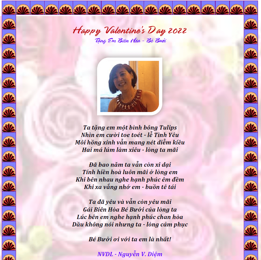| Nghĩa Tào Khang Tôi đã yêu em thật nhiều rồi Luân hồi bao kiếp … nghĩ mình tôi Ðược gặp cùng em nên duyên nợ Nối nghĩa tào khang … sống trọn đời Tôi muốn cùng em tay nối tay Ði khắp quê hương hết cả ngày Từ Bắc sang Nam lên miệt núi Và miền Ðông biển tới miền Tây Thượng Ðế yêu hàng tỷ con chiên Còn tôi yêu mỗi chỉ mình Liên Ngày xưa thi phú … hồn lãng mạn Giờ bến dừng chân … chẳng chút phiền Ta cảm ơn em đến với đời Mỗi ngày tận hưởng những niềm vui Coi phim … cùng hát … rồi chơi trống Hạnh phúc triền miên … hưởng thú đời ❤️💕💓💕❤️ Em luôn mang tính ngọt ngào Vẫn nguồn thi hứng dạt dào năm xưa Bi chừ viết tặng vần thơ Dẫu ngoài trời lạnh – phất phơ mưa phùn Cảm ơn em tặng nụ hôn Giờ đây vẫn thấy nghe hồn ngất ngây Ta chúc em được một ngày Ngập tràn hạnh phúc, chiều nay…ăn mừng NVD |