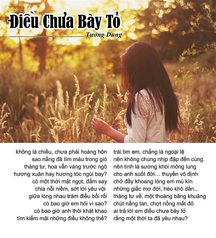 | Ngày Mưa Nhớ Nhà Tháng năm 2015 Những ngày mưa đem về nỗi nhớ Chạnh lòng ta thầm gọi quê hương Ta ra đi thành người xa xứ Bạn bè xưa nay ở nơi đâu Ta ra đi giã từ quá khứ Đổi cuộc đời theo cánh chim bay Ta mang theo nỗi niềm khao khát Một bầu trời kỷ niệm ước mơ Ta cất đi nhũng ngày tháng cũ Áo trắng học trò thôi hết mang Bao nhiêu năm ta vẫn trông chờ Ngày tự do quê hương chào đón Mưa còn rơi ta còn mong đợi Ngày hân hoan hết cảnh sầu thương Ta về lau nước mắt phân ly Mừng non nước thoát thời bão tố Diệm Trân |