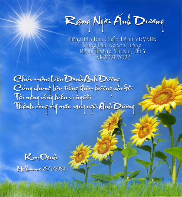 | ÁNH DƯƠNG TIÊN RỒNG Ánh Dương soi rõ hồn sông núi Chữ nghĩa nâng tình người lòng ta Gửi hương cho gió lành quê mẹ Thiên hương quốc ngữ liên thành hoa… MD.06/16/20 LuânTâm Xin vui lòng ủng hộ dồn phiếu bầu cho liên danh ÁNH DƯƠNG vào BCH VĂN BÚT VIỆT NAM HẢI NGOẠI nhiệm kỳ 2021-2023 |