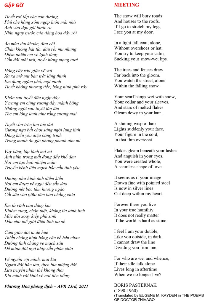 | 2. Fleeing The Motherland In April https://www.youtube.com/watch?v=6gu9bPcSM1g FLEEING THE MOTHERLAND IN APRIL Today’s Black April Day, The day when I left my motherland 45 years ago. The day of leaving my country to seek Freedom in some unknown land. In the night of that year, grenade flares lighting up the sky, and sounds of gunfire following the people frantically running … everywhere. Holding my baby in my arms, my eyes filled with tears. Farewell Mother. O Dear Mother, I have to leave you now. Living in a foreign land with a pained heart, I long for my homeland and Mother. Alas! Feels like my heart’s being cut into pieces. See the trees and think of my home village’s bamboo trees. See the clouds and think of my Beloved Mother. I dream of returning to my old home town. Watch Mother’s going in and out of the betel garden. Eat a bowl of soup that Mother just cooked. But alas! A dream is only a dream! Forty five years of waiting in languish for the Yellow Flag With Three Red Stripes, to hold against my tear-filled heart. O My Beloved Motherland! When will I ever return? To lie in a liberated land. Translated by Vương Thanh 26-9-2020 |