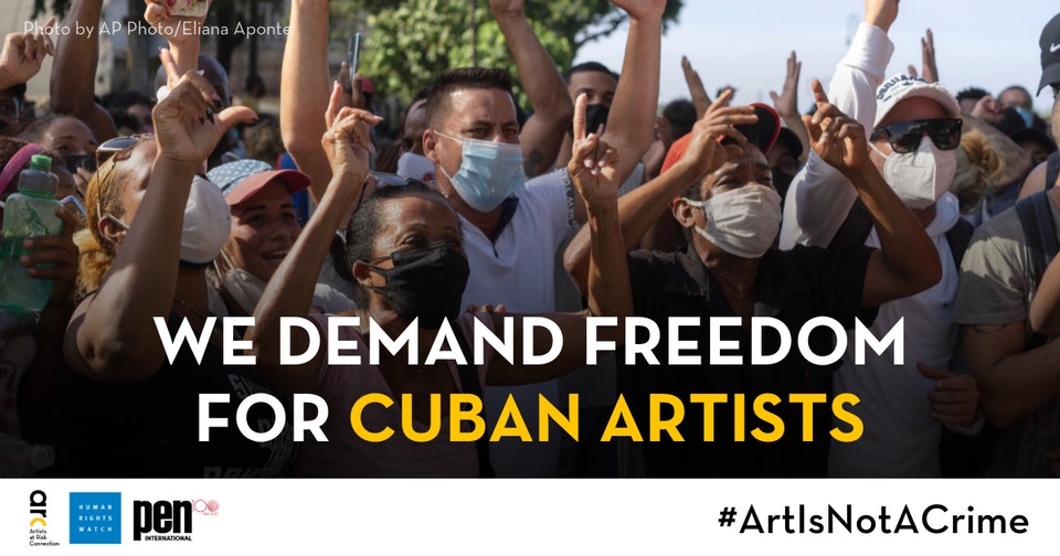 | In the last several months, the campaign of persecution and harassment against artists in Cuba has reached terrifying new levels. On July 11, after historic mass protests broke out across the country, police and security forces carried out arbitrary arrests and physical attacks against peaceful protesters, detaining more than 1,120 artists and creatives. At least 50 artists have been under house arrest, imprisoned, or criminal investigation in recent months. Artists have been on the frontlines of the protest movement in Cuba for months, using their platforms to draw national and international attention to social and political inequities on the island. Now, over 300 prominent figures from the arts are calling on the Cuban government to immediately stop its abuses against Cuban artists in a powerful statement co-signed by PEN International, the Artists at Risk Connection (ARC) at PEN America, and Human Rights Watch. Signatories include Meryl Streep, Orhan Pamuk, Paul Auster, Elena Poniatowska, Isabel Allende, J. M. Coetzee, Jules Feiffer, and Khaled Hosseini, as well as notable Cuban artists, including Tania Bruguera, Coco Fusco, and Hamlet Lavastida. Our letter calls on the Cuban regime to respect the fundamental role that art and artists play in society, and immediately stop harassing artists for engaging in political and social critiques of the regime while exercising their right to creative expression. |