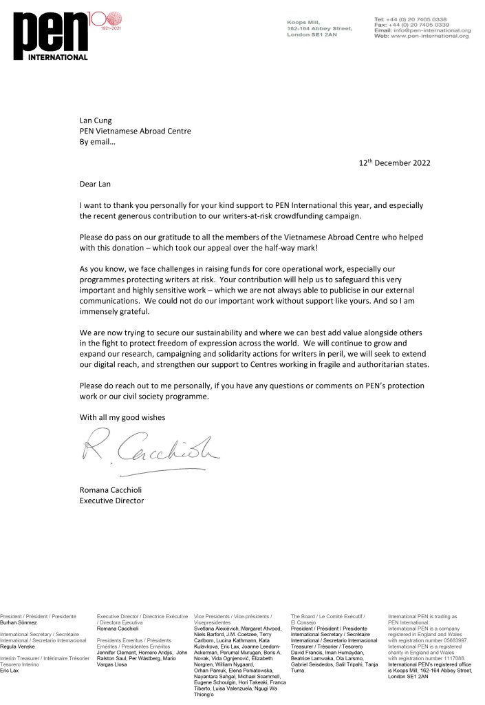 | Thư từ Văn Bút Quốc Tế của giám đốc điều hành Romana Cacchioli gửi đến hội viên Văn Bút Việt Nam Hải Ngoại Ngày 12 tháng 12,2022 Lan thân mến, Tôi xin cảm ơn sự ủng hộ quý báu của các bạn cho Văn Bút Quốc Tế năm nay, và sự đóng góp hào phóng gần đây của các bạn cho chiến dịch huy động quỹ cho các nhà văn của chúng ta đang trong tình trạng nguy hiểm. Xin hãy chuyển đến các Hội viên của Văn Bút Việt Nam Hải Ngoại lòng tấm lòng biết ơn của chúng tôi đối với việc các bạn đóng góp cho chiến dịch này. Hiện nay, chúng ta đã đạt được một nửa chỉ tiêu đặt ra. Như các bạn đã biết, chúng tôi gặp nhiều thử thách khi huy động quỹ cho những việc làm trọng yếu, đặc biệt là chương trình bảo vệ các nhà văn đang gặp nguy hiểm. Sự đóng góp của các bạn giúp Văn Bút QuốcTế chúng ta củng cố việc làm quan trọng và nhạy cảm mà chúng ta không thể phổ biến rộng rãi qua việc truyền thông bên ngoài. Chúng tôi không thể làm được chuyện quan trọng này nếu không có sự hỗ trợ của các bạn. Vì vậy tôi vô cùng biết ơn các bạn. Bây giờ chúng ta cố gắng giữ vững và bảo vệ tất cả những phần mà chúng ta có thể thêm vào trong công cuộc đấu tranh bảo vệ quyền tự do ngôn luận trên toàn thế giới. Chúng ta sẽ tiêp tục phát triển và mở rộng nghiên cứu, chiến dịch, và hoạt động liên kết cho những nhà văn đang trong tình trạng nguy hiểm, chúng ta sẽ tìm cách nới rộng, và củng cố sự hỗ trợ cho những trung tâm Văn Bút hoạt động ở các nước yếu kém và độc tài. Xin liên lạc với tôi nếu bạn có thắc mắc hay góp ý cho công việc bảo vệ hay chương trình xã hội dân sự của Văn Bút Quốc Tế. Gửi đến các bạn những lời chúc tốt đẹp của tôi, Romana Cacchioli Giám đốc điều hành |
