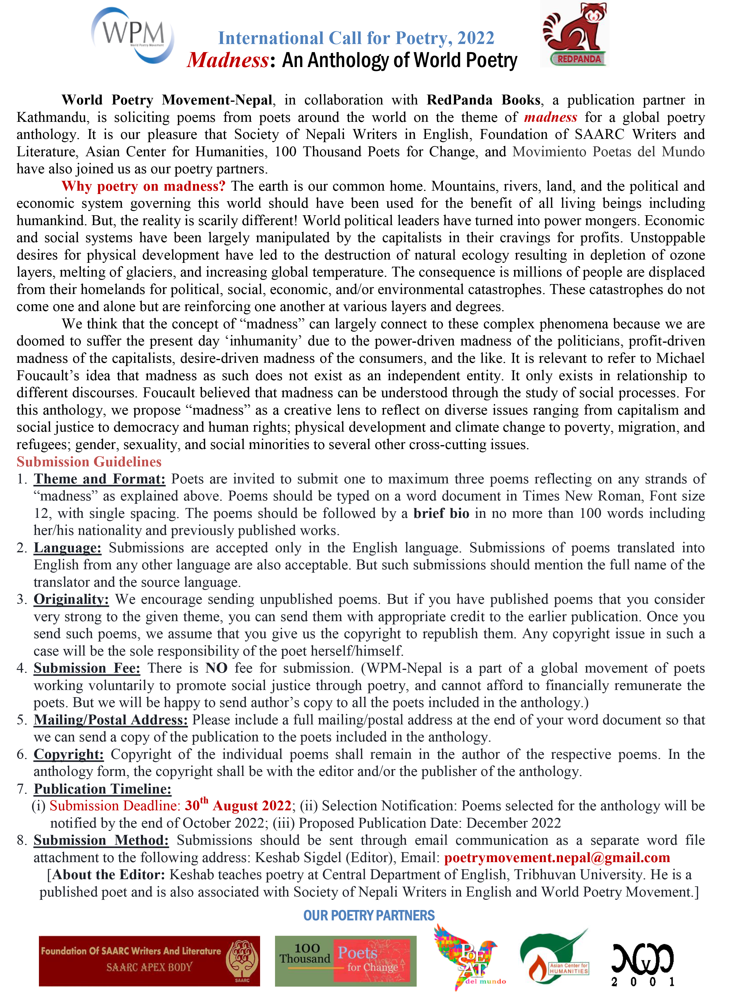 ![]() Ngày 09 tháng 02 năm 2022 Quý Văn Hữu VBVNHN kính mến, Cung Lan kính chuyển thư kêu gọi của ông Keshab Sigdel về sự đóng góp thi phẩm của quý Thi hữu. Xin đọc thông tin dưới đây: Dear President and fellow writers PEN Vietnamese Abroad Center I write to share with you an open call for poetry for an international poetry anthology. The information about the theme and other submission details are provided in the announcement attached below. I request your cooperation to share this call for poetry to poets in your contacts. Thank you! warmest regards, keshab — KESHAB SIGDEL A/Professor Central Department of English, Tribhuvan University Kirtipur, Kathmandu, Nepal Kính thưa chủ tịch và các bạn văn nghệ sĩ Trung Tâm Văn Bút Việt Nam Hải Ngoại Tôi viết thư để chia sẻ với các bạn lời kêu gọi góp thi phẩm cho tuyển tập thơ quốc tế. Thông tin về chủ đề và các chi tiết gửi khác được cung cấp trong thông báo đính kèm dưới đây. Tôi mong mỏi sự hợp tác của bạn trong việc chia sẻ lời kêu gọi đóng góp thi phẩm của các thi sĩ trong trung tâm Văn Bút của bạn. Cảm ơn bạn! trân trọng kính chào, keshab — KESHAB SIGDEL Phụ tá giáo sư Khoa tiếng Anh trung tâm, Đại học Tribhuvan Kirtipur, Kathmandu, Nepal ![]() BCH cố gắng tạo điều kiện để quý Văn hữu phát triển tác phẩm của mình lan rộng khắp thế giới. Nếu quý VH muốn tham gia, xin lưu ý các mục sau: 1. …Các thi sĩ tham gia cần gửi một (1) đến ba(3) bài thơ phản ánh về bất kỳ phần nào của “Sự điên rồ”. Bài thơ nên được đánh trên một văn bản từ trong Times New Roman, cỡ chữ12, với khoảng cách duy nhất. Các bài thơ phải được theo sau bởi một tiểu sử ngắn gọn, không quá 100 từ, bao gồm quốc tịch của quý vị và các tác phẩm đã xuất bản trước đây. 2. Ngôn ngữ: Bài dự thi chỉ được chấp nhận bằng ngôn ngữ tiếng Anh. Những bài thơ được dịch sang Tiếng Anh từ bất kỳ ngôn ngữ nào khác cũng được chấp nhận. Nhưng những nội dung gửi như vậy nên đề cập đến tên đầy đủ của phiên dịch và ngôn ngữ nguồn. 3. Tính nguyên bản: Chúng tôi khuyến khích gửi những bài thơ chưa được xuất bản. Nhưng nếu bạn đã xuất bản những bài thơ mà bạn cho là sâu đậm đối với chủ đề đã cho, bạn có thể gửi chúng với tín dụng thích hợp cho ấn phẩm trước đó. Một khi bạn gửi những bài thơ như vậy, chúng tôi cho rằng bạn cho chúng tôi bản quyền để tái bản chúng. Bất kỳ vấn đề bản quyền nào trong trường hợp này sẽ do thi sĩ tự chịu trách nhiệm. 4. Phí nộp hồ sơ: KHÔNG có lệ phí nộp hồ sơ. (WPM-Nepal là một phần của phong trào toàn cầu của các thi sĩ làm việc tự nguyện để thúc đẩy công bằng xã hội thông qua thơ ca, và không có khả năng trả công các thi sĩ. Nhưng chúng tôi sẽ vui lòng gửi bản sao của tác giả cho tất cả các nhà thơ có trong tuyển tập.) 5. Địa chỉ Gửi thư / Bưu điện: Vui lòng bao gồm địa chỉ gửi thư / bưu điện đầy đủ ở cuối tài liệu word của bạn để chúng tôi có thể gửi một bản sao của ấn phẩm cho các nhà thơ có trong tuyển tập. 6. Bản quyền: Bản quyền của từng bài thơ sẽ thuộc về tác giả của các bài thơ tương ứng. Bên trong hình thức tuyển tập, bản quyền sẽ thuộc về người biên tập và / hoặc nhà xuất bản tuyển tập. 7. Thời gian xuất bản: (i) Hạn chót nộp hồ sơ: 30 tháng 8 năm 2022; (ii) Thông báo tuyển chọn: Các bài thơ được chọn cho tuyển tập sẽ đượcthông báo đến cuối tháng 10 năm 2022; (iii) Ngày xuất bản đề xuất: tháng 12 năm 2022 8. Phương thức gửi: Bài dự thi phải được gửi thông qua liên lạc email dưới dạng tệp word riêng biệt, đính kèm theo địa chỉ sau: Keshab Sigdel (Biên tập viên), Email: poetrymovement.nepal@gmail.com Kính thưa quý Văn thi hữu, Sự tham gia không phải bắt buộc. Nếu quý VH có cảm hứng thì đừng nên bỏ cơ hội. Kính chúc bình an và may mắn, T.M Ban Chấp Hành Cung Thị Lan |