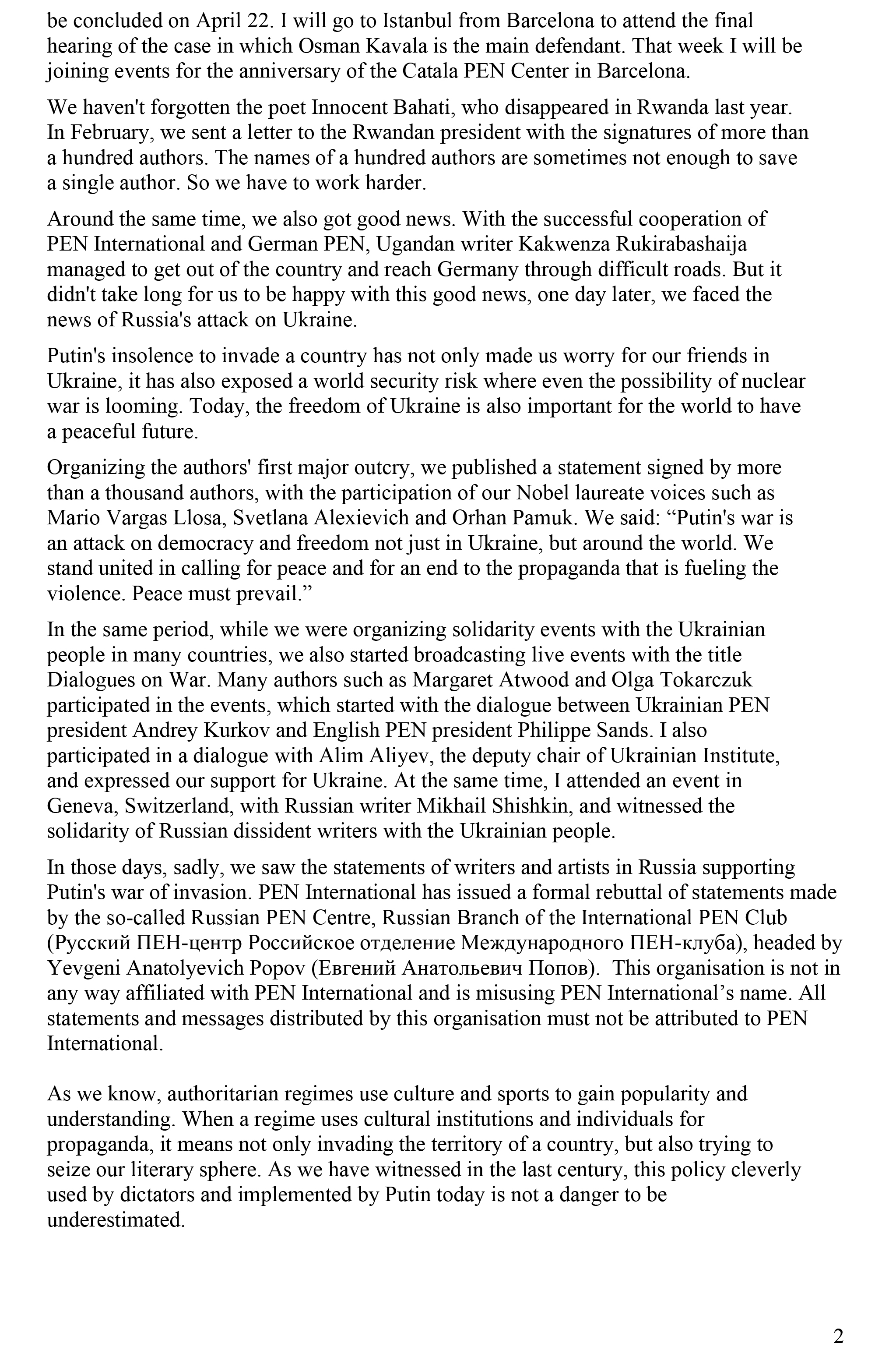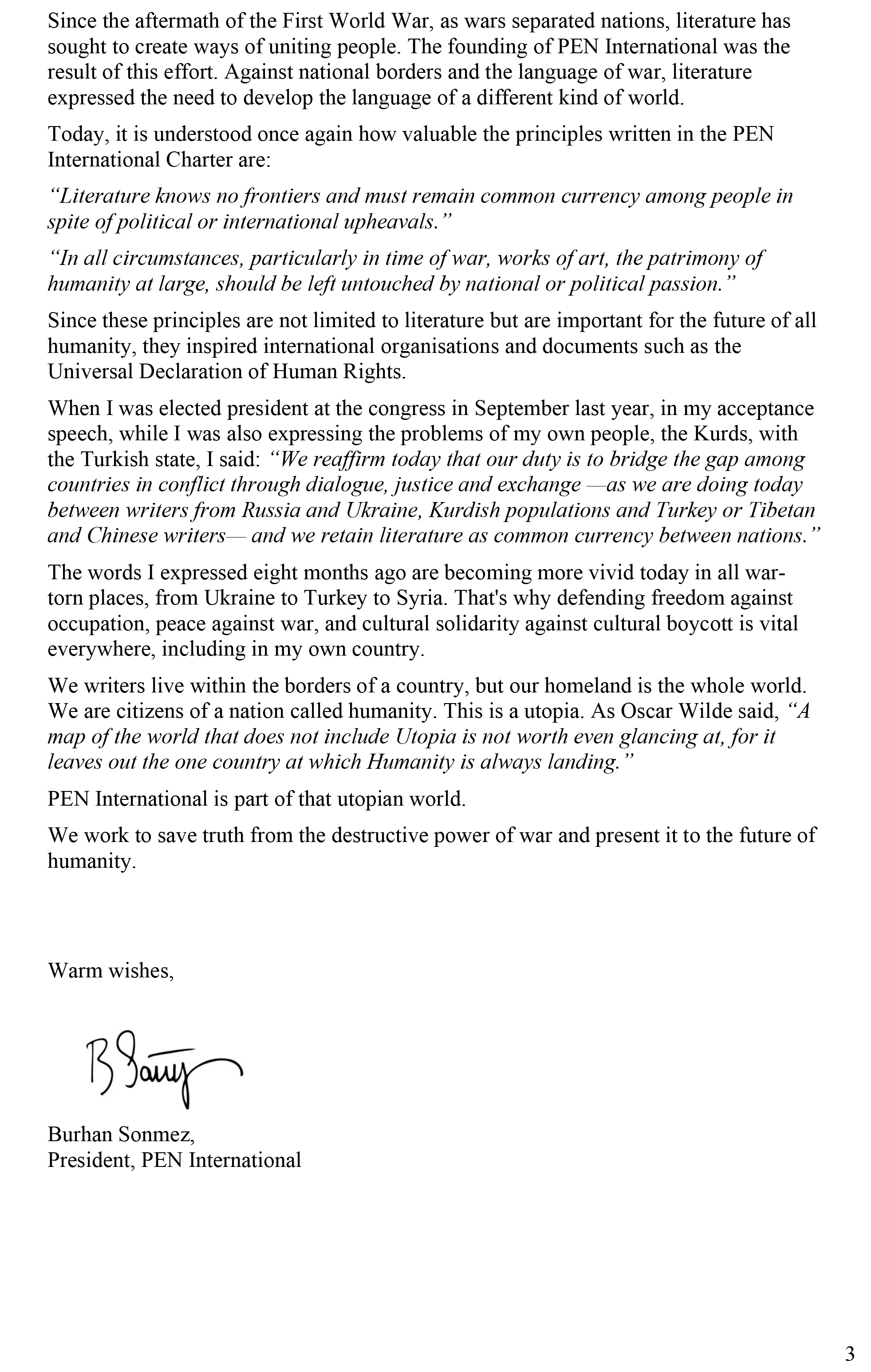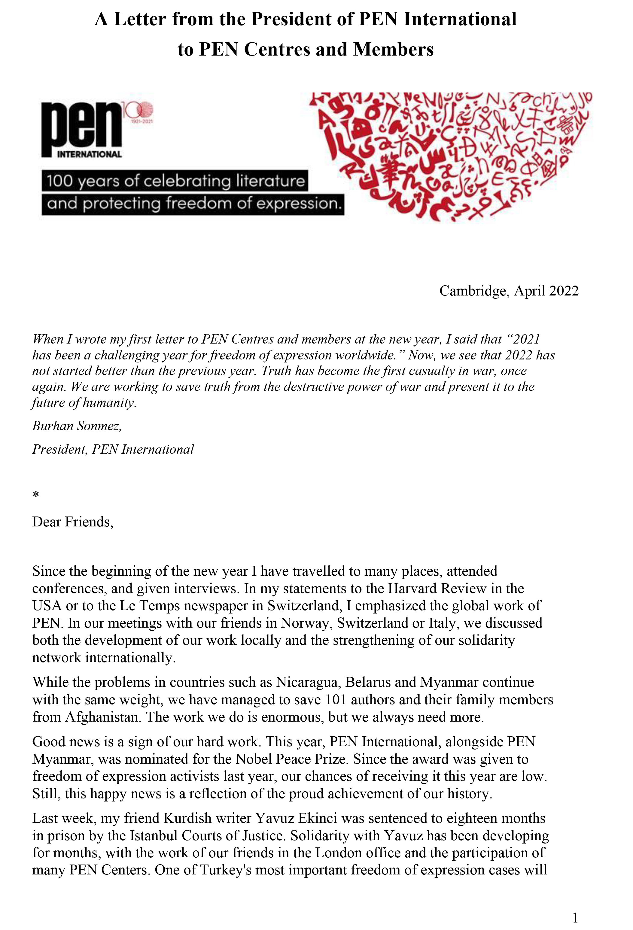 Thư của ông Burhan Sonmez chủ tịch Văn Bút Quốc Tế gửi các trung tâm Văn Bút và hội viên Văn Bút![]() ![]() ![]() |