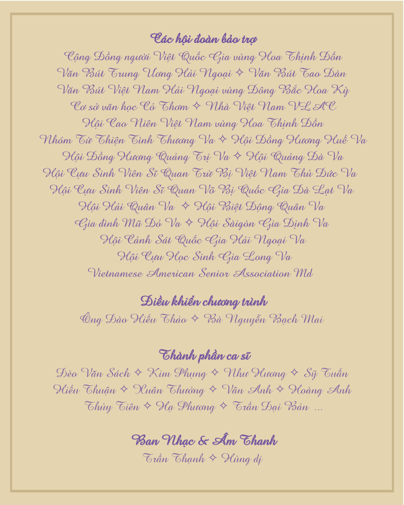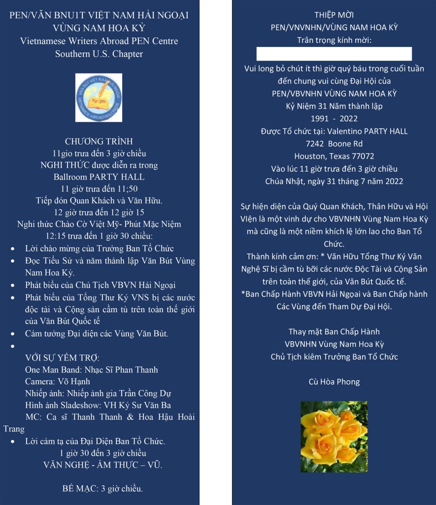 | Văn Bút Việt Nam Hải Ngoại vùng Nam Hoa Kỳ tổ chức Đại Hội kỷ niệm 31 năm thành lập vào ngày chủ nhật 31 tháng 7, 2022 từ 11 giờ trưa đến 3 giờ chiều tại VALENTINO PARTY HALL ( 7242 Boone Rd Houston Texas 77072) Chủ tịch Cù Hòa Phong và Ban Chấp Hành VB VNHK trân trọng kính mời quý Văn thi hữu bỏ chút thì giờ quý báu đến chung vui cùng Đại Hội Văn Bút Việt Nam Hải Ngoại vùng Nam Hoa Kỳ. |
