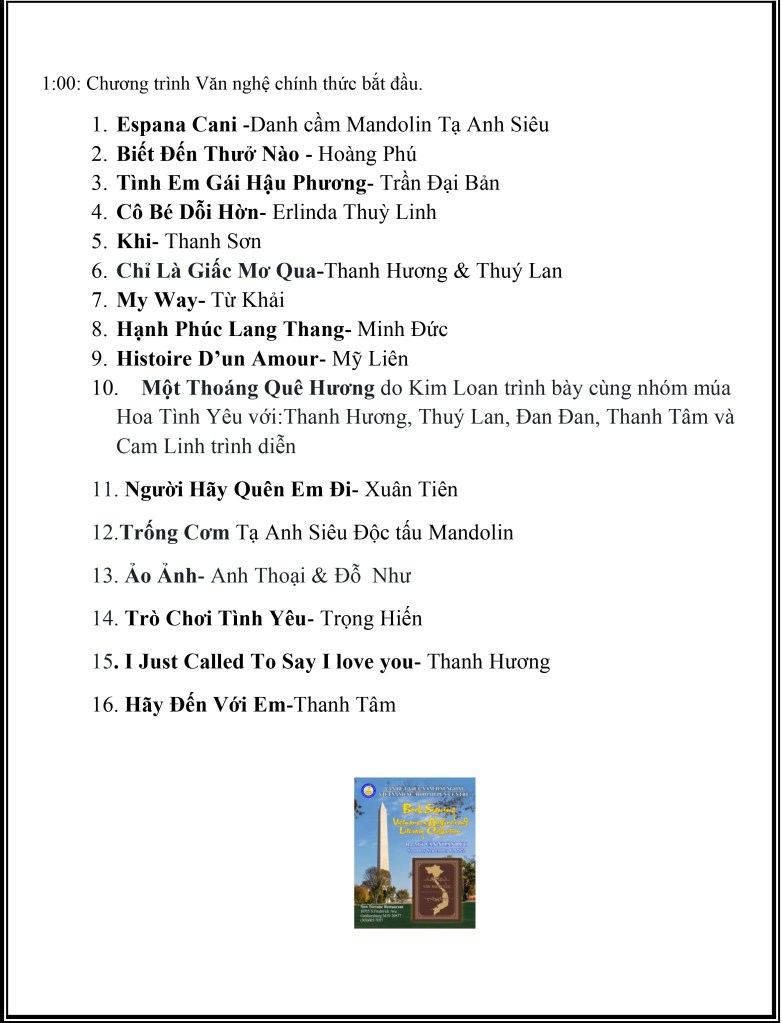 ![]() https://vietpen.org/ Kính thưa quý Văn Thi hữu VBVNHN, BCH kính gửi lại toàn bộ chương trình Đại Hội để quý Văn Hữu tiện việc xem lại ngày giờ, địa điểm và nội dung các chương trình khi cần: THÔNG BÁO Đại Hội Văn Bút Việt Nam Hải Ngoại kỳ XII Hoa Thịnh Đốn, Hoa Kỳ 16-17.10.2021 HS: TB/2021/ĐHXII.02 Đại Hội Văn Bút Việt Nam Hải Ngoại kỳ XII do Ban Chấp Hành VBVNHN triệu tập theo quy định trong Điều Lệ VBVNHN [14(a) & 17] sẽ được tổ chức tại Hoa Thịnh Đốn Trưởng Ban Tổ Chức: VH Hồng Thủy, Chủ tịch VBVNHN/Vùng Đông Bắc Hoa Kỳ Trưởng Ban Bầu Cử: VH Đăng Nguyên, Chủ tịch Ủy Ban Định Chế VBVNHN Địa điểm: NHÀ HÀNG LITTLE SAIGON 6218-B WILSON Blvd, Falls Church, VA 22044. (GẦN EDEN CENTER Khu thương mại Việt Nam vùng Hoa Thịnh Đốn) Điện thoại 703-536-2633 Thời gian: Hai ngày 16 và 17 tháng 10, 2021 Thành phần tham dự: Chủ tịch các vùng VBVNHN, Hội viên VBVNHN, và thân hữu. Phi trường: 1. Ronald Reagan Washington National Airport 2. Washington Dulles International Airport Khách sạn: Best Western Falls Church 703-532-9000 Courtyard by Marriott Dunn Loring Fairfax 703-573-9555 Đại Hội Văn Bút Việt Nam Hải Ngoại là sinh hoạt chính thức của Văn Bút Việt Nam Hải Ngoại được Ban Chấp Hành VBVNHN triệu tập theo chu kỳ ba (3) năm. Các Ban Đại Diện Vùng VBVNHN nếu hội đủ tiêu chuẩn tối thiểu 12 hội viên có thể gửi tối đa năm (5) Đại Biểu tham dự. Chủ tịch vùng nếu vì lý do chính đáng không thể tham dự, xin hãy cử đại diện của vùng. Các hội viên không có tư cách Đại Biểu có quyền dự thính nhưng không được phát biểu ý kiến trong các phiên họp của Đại Hội Đồng Văn Bút Việt Nam Hải Ngoại. I/ Ngày thứ Bảy 16-10-2021: Địa điểm: NHÀ HÀNG LITTLE SAIGON 6218-B WILSON Blvd, Falls Church, VA 22044. (GẦN EDEN CENTER Khu thương mại Việt Nam vùngHoaThịnh Đốn) Đại Hội Đồng Văn Bút Việt Nam Hải Ngoại kỳ XII sẽ chính thức khai mạc vào lúc 10 giờ đúng sáng ngày thứ Bảy 16-10-2021. Chương trình Đại Hội Văn Bút Việt Nam Hải Ngoại kỳ XII Washington, DC October 16, 2021 Đại Hội VBVNHN kỳ XII do Ban Chấp Hành VBVNHN 2018-2020 triệu tập vào tháng 12-2020 và do Covid-19 nên dời 2 lần đến tháng 10-2021. I. Đại Hội Đồng Văn Bút Việt Nam Hải Ngoại kỳ XII [Đại Hội Đồng là cơ quan tối cao của Trung Tâm Văn Bút Việt Nam Hải Ngoại (Điều Lệ, Chương V, Điều 15)] Chào quốc kỳ Việt Nam Cộng Hòa và Hoa Kỳ Chào mừng Đại Biểu: Trưởng Ban Tổ Chức Hồng Thủy Chủ Tọa Đoàn kiểm túc số Đại Biểu và khai mạc Đại Hội Đồng VBVNHN kỳ XII Đại Hội Đồng VBVNHN kỳ XII chính thức khai mạc Ban Chấp Hành 2018-2020tổng kết thành quả hoạt động: Phó Chủ tịch Lê Hữu Liệu Trao đổi giữa Ban Chấp Hành 2018-2020 và Đại Biểu (tham khảo & tri ân) Tường trình của Ban Bầu Cử: Trưởng Ban Bầu Cử Đăng Nguyên Thụ ủy liên danh đắc cử giới thiệu thành viên Ban Chấp Hành 2021-2023 Chủ Tọa Đoàn Đại Hội Đồng chuyển giao cho Ban Chấp Hành 2021-2023 Thảo luận các nghị quyết của Đại Biểu (nếu có) và duyệt xét tu chính Nội Qui theo đề nghị của Ban Tu Chính Chỉ định Vùng tổ chức Đại Hội VBVNHN kỳ XIII Đại Hội Đồng VBVNHN kỳ XII bế mạc II Liên Hoan Đại Hội Văn Bút Việt Nam Hải Ngoại kỳ XII 12 giờ trưa đến 4 giờ chiều cùng ngày thứ Bảy 16-10-2021: Chào quốc kỳ Việt Nam Cộng Hòa và Hoa Kỳ Chào mừng quan khách: Trưởng Ban Tổ Chức Hồng Thủy Tóm lược hoạt động 2018-2020: Chủ tịch Ban Chấp Hành 2018-2020 Diễn văn khai mạc: Chủ tịch Ban Chấp Hành 2021-2023 Giới thiệu thành viên Ban Chấp Hành 2021-2023 Tiệc liên hoan & văn nghệ Chương Trình Văn Nghệ Đại Hội VBVNHN Kỳ XII Vào Trưa Thứ Bảy Ngày 16/10/2021 Tại LITTLE SAIGON Restaurant Vùng HTĐ Trưởng Ban Tổ Chức: Hồng Thuỷ MC: Đào Hiếu Thảo Phụ Trách Chương Trình Văn Nghệ: Từ Khải & Hoàng Phú, Kevin Phạm, Bảo Huy Âm Thanh: Thái Trinh, Bảo Huy Chương Trình Văn Nghệ: 1/ Hợp ca VBVNHN/Vùng ĐBHK và văn thân hữu: VN Minh Châu Trời Đông (Hùng Lân) 2/ Thanh Hương, Hoàng Phượng, Hoàng Phú: Và Tôi Cũng Yêu Em (Đức Huy) 3/ Xuân Tiên: Chuyện Thường Tình Thế Thôi (Lê Quang) 4/ Thuỳ Linh: Bambino (Dalida) 5/ Bản Trần: Xuân Viễn Xứ (thơ Hồng Thuỷ, phổ nhạc Nguyễn Ánh 9) 6/ Hoàng Phượng: Chuyện Người Dệt Lụa (thơ Hoàng Phượng) 7/ Kevin Phạm: Dư Âm (Nguyễn Văn Tý) 8/ Thanh Sơn: Tóc Xưa (Ngô Thuỵ Miên) 9/ Thuý Lan: Tình Nồng Cháy (Anh Bằng) 10/ Thanh Hương: Casablanca (Bertie Higgins) 11/ Thái Trinh- Môi Tím: Bài Không Tên Số 8 (Vũ Thành An) 12/ Hoàng Phú: Take Me Home, Country Roads (John Denver) 13/ Từ Khải: Love Me With All Of Your Heart (Engelbert Humperdinck) 14/ Bảo Huy: Sầu Đông (Khánh Băng) 15/ Văn Bút và Quan Khách Đồng Ca: Việt Nam Quê Hương Ngạo Nghễ (Nguyễn Đức Quang) 16/ Ban Nhạc: Hello, Goodbye (The Beatles) II/ Ngày Chủ Nhật 17-10-2021 *Buổi sáng: (Tuỳ ý) · Tham quan du ngoạn thủ đô Hoa Thịnh Đốn( Tự túc) · Hội Sách triển lãm, bán và tặng do VBVNHN kết hợp với Nhà Việt Nam tổ chức từ 10:30 đến 11:30 sáng tại thương xá Eden ( Nếu muốn tham gia lâu hơn tuỳ ý) (6763 Wilson Blvd., Fall 