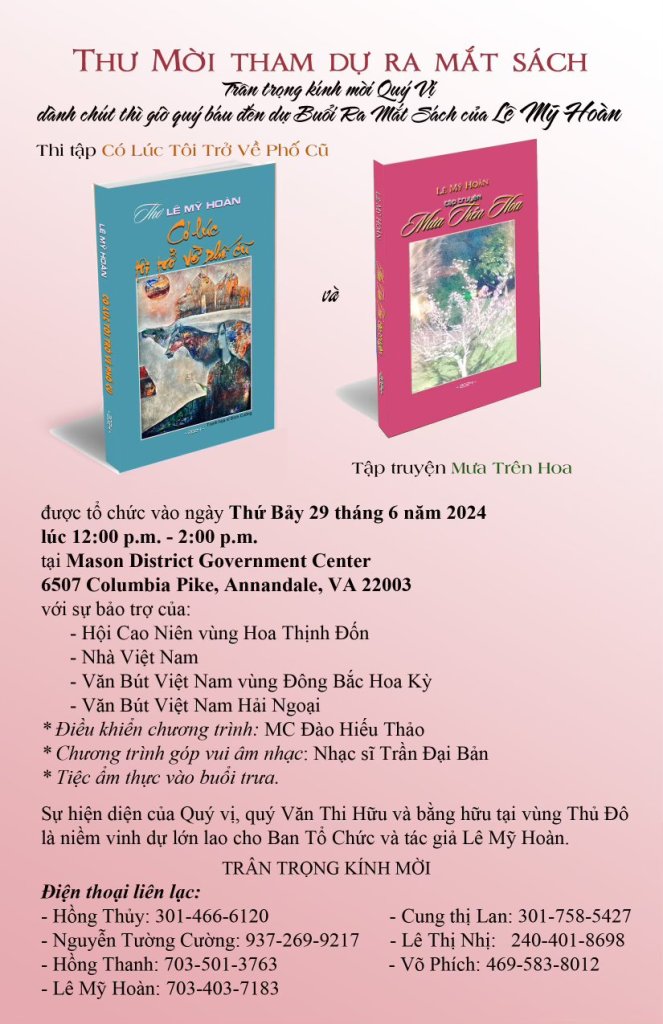 THÔNG BÁO RMS của Văn Thi Sĩ Y Thy Võ Phú![]() Kính thăm quý văn hữu VBVNHN, Cung Lan xin thay mặt BCH VBVNHN kính mời quý văn hữu ghi lịch ngày 14 tháng 4 năm 2024 để tham dự buổi Ra Mắt Sách của văn thi sĩ Y Thi Võ Phú tại Mason District Government Center Văn thi sĩ Y Thi Võ Phú là hội viên chính thức của VB VNHN thuộc VBVĐBHK. Văn hữu Y Thy Võ Phú rất đa tài nhưng rất khiêm cung và kín đáo. Kính mời quý văn hữu vào trang tác giả của Y Thy Võ Phú để hiểu rõ thêm tác giả và tác phẩm của văn hữu rất tài hoa này. Y Thy – Võ Phú Y Thy – Võ Phú Tiểu SửBút hiệu: Võ Phú (văn) & Y Thy/i (thơ).Võ Phú sinh ngày 10 tháng 11. Sinh quán Nha Trang – Việt Nam; định… Cung Lan mong quý văn hữu tham dự đông đủ Ra Mắt Sách ngày 14 tháng 4 năm 2024 để ủng hộ văn thi sĩ Y Thi Võ Phú và cùng có những tấm hình kỷ niệm đáng nhớ. Kính chúc quý văn hữu một buổi tối an lành, đầm ấm. Kính mến, Cung Thị Lan |