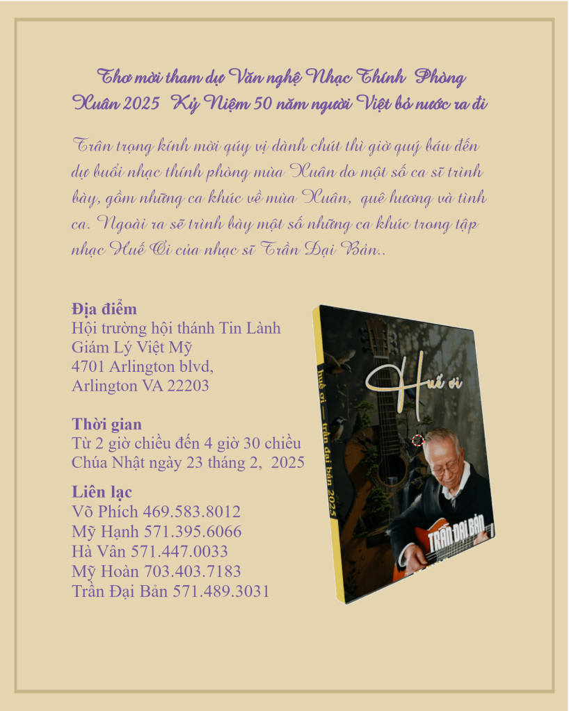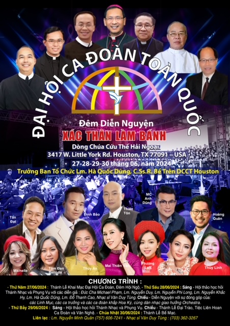| Kính thăm quý văn hữu VBVNHN, Thứ Sáu ngày 28.06.2024 (June 28 2024), có buổi hòa nhạc Công giáo tại thành Phố Houston, Texas. Đây là buổi hòa nhạc rất công phu và qui mô. Cho nên, nếu quý văn hữu vùng Nam Hoa Kỳ muốn thưởng thức xin hãy ghi lịch để tham dự. ![]() Tham dự buổi hòa nhạc không nhất thiết là những người có cùng tôn giáo. Vì thế, Cung Lan xin kính mời quý văn hữu vùng Nam Hòa Kỳ cố gắng dành thì giờ tham dự để thưởng thức, ủng hộ bạn văn, và chụp hình lưu niệm. ![]() ![]() Kính mời quý văn hữu xem kỹ danh sách các ca sĩ trong chương trình và viếng trang tác giả nhạc sĩ Văn Duy Tùng để rõ hơn tài sáng tác của nhạc sĩ Văn Duy Tùng để không bỏ cơ hội một chương trình hay: VĂN DUY TÙNG Văn Duy TùngSinh tại Huế- Sang Hoa Kỳ năm 1981Hiện sống với gia đình tại vùng thủ đô Hoa Thịnh Đốn (Washington D… Nếu quý văn hữu nào muốn tham dự, xin cho Văn hữu nhạc sĩ Văn Duy Tùng biết để gửi Thư Mời riêng (VIP) và đón tiếp đặc biệt. Văn Duy Tùng : vanduytung1@gmail.com Chân thành cảm ơn sự quan tâm của quý văn hữu. Kính mến, Cung Thị Lan |