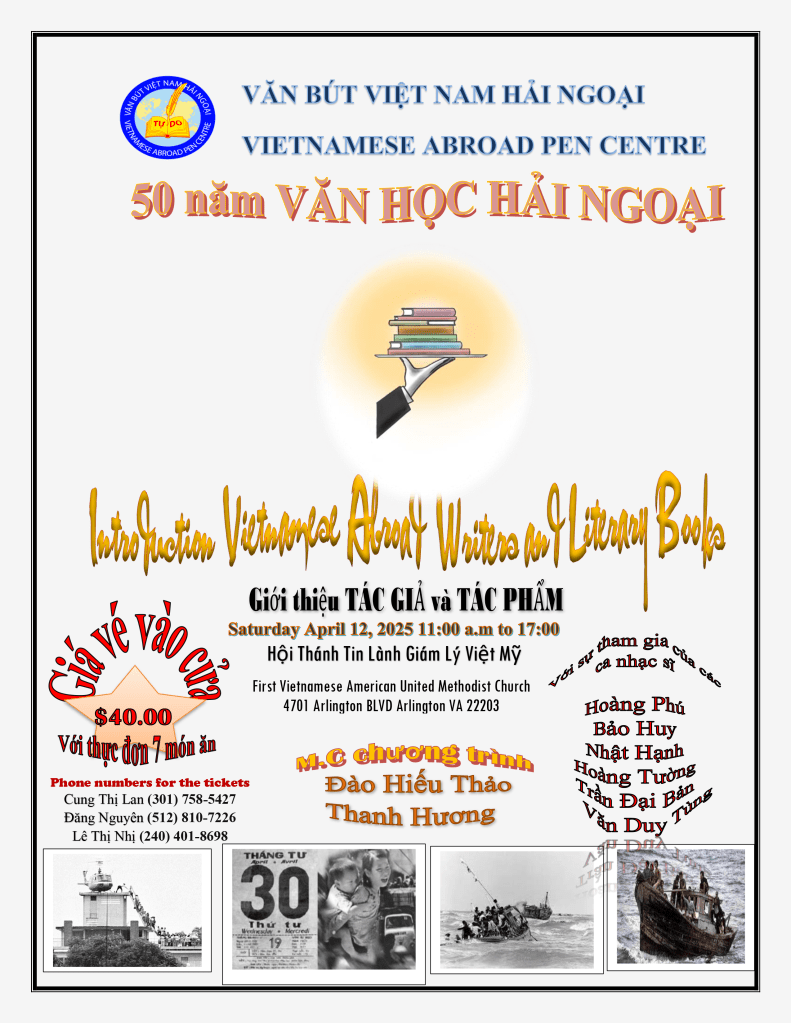 | Thông Báo: Chương Trình Tưởng niệm tháng Tư Đen và 50 năm nhìn lại VĂN HỌC VIỆT NAM HẢI NGOẠI Ngày 12 tháng 4 năm 2025 từ 11: 00 A.M đến 17:00 P.M tại Hội Thánh Tin Lành Giám Lý Việt Mỹ 4701 Arlington BLVD Arlington VA 22203 ![]() *Thành phần tham dự: Chủ tịch các vùng VBVNHN, Hội viên VBVNHN, và thân hữu. *Ban Tổ Chức: VH Cung Thị Lan, Chủ tịch VBVNHN/Trung Ương cùng Ban Chấp Hành VBVNHN: VH Đăng Nguyên, VH Erlinda Thuỳ Linh, VH Lê Thị Ý và VH Lê Thị Nhị *Phi trường: (Tuỳ quý VH định đoạt) 1. Ronald Reagan Washington National Airport 2. Washington Dulles International Airport *Khách sạn: (Gần địa điểm tổ chức RMS Kỷ niệm 50 năm VĂN HỌC VIỆT NAM HẢI NGOẠI) 1. Hilton Garden Inn Fairfax– 3950 Fair Ridge Dr, Fairfax, VA 22033-+1(703)385-7774. 2. Days Inn by Wyndham Arlington Pentagon- 3030 Columbia Pike, Arlington, VA 22204-+1(703)521-5570 3. Inns of Virginia – Arlington- 3335 Langston Blvd., Arlington, VA 22207- +1(703)524-9800 *Vui lòng xem thêm các khách sạn sau: 1. Hilton Arlington: 950 N Stafford St, Arlington, VA 22203-+1(703)528-6000 2. Best Western Falls Church 703-532-9000 3. Courtyard by Marriott Dunn Loring Fairfax 703-573-9555 BCH Văn Bút Việt Nam Hải Ngoại kính mong quý Văn hữu dành thì giờ quý báu để tham gia buổi Ra Mắt Sách Tưởng niệm Tháng 4 Đen và 50 năm nhìn lại VĂN HỌC VIỆT NAM HẢI NGOẠI Như quý văn hữu đã biết, số tiền hội phí của quý Văn hữu gửi BCH chuyển đến Văn Bút Quốc Tế và chi phí bưu chính. Đã từ lâu, Văn Bút Việt Nam Hải Ngoại (VBVNHN) không có quỹ. Hầu hết những chi phí đều do chủ tịch hay BCH chi trả. Vì vậy, để tổ chức buổi Ra Mắt Sách thành công và ý nghĩa BCH kính mong quý Văn hữu ủng hộ qua các phương cách sau: 1. Tham dự và Ủng hộ vé tham dự. Một vé 40 Mỹ Kim- Vui lòng đặt mua vé ủng hộ trước ngày Ra Mắt sách 12 tháng 4, 2025 để BCH tiện việc sắp xếp chỗ ngồi( Rất mong quý VH cư ngụ trong vùng Hoa Thịnh Đốn tham dự đông đủ, dù có tham gia giới thiệu sách trong buổi RMS hay không) 2. Kêu gọi thân hữu cả Việt lẫn không phải người Việt tham dự. ( Quý Văn hữu có thể đặt luôn cả một bàn 8 người.) 3. Là Mạnh thường quân gửi ngân phiếu ủng hộ trước ngày Ra Mắt sách 12 tháng 4,2025. Vui lòng gửi đến To: 2 Stratford Garden Ct Silver Spring MD 20904 USA Pay to: Vietnamese Abroad PEN Centre Memo: Ủng hộ Ra Mắt Sách của VHVNHN Tưởng niệm tháng Tư Đen và 50 năm nhìn lại Sau khi gửi ngân phiếu, vui lòng báo cho nhóm BCH VBVNHN để BTC tiện việc ghi chép. Ban Chấp Hành VBVNHN sẽ thông báo cụ thể chương trình Ra Mắt Sách Tưởng niệm Tháng 4 Đen và 50 năm nhìn lại VĂN HỌC VIỆT NAM HẢI NGOẠI vào giữa tháng hai năm 2025 nhưng trước tiên, kính xin quý văn hữu thực hiện các việc làm cần thiết sau: 1. Ghi ngày trong lịch để tham gia: (Thứ Bảy 12 tháng 4 năm 2025) 2. Gửi email cho BCH VBVNHN biết quý văn hữu muốn đem sách về và giới thiệu tác giả tác phẩm trong buổi RMS. 3. Gửi email cho nhóm emails của BCH VBVNHN cunglan@yahoo.com; Kynguyenmoi1@gmail.com; ngdang99@yahoo.com; ytle39@gmail.com; erlinda6464@yahoo.com cho biết quý văn hữu tham gia chương trình văn nghệ Gửi email cho nhóm emails của BCH VBVNHN: cunglan@yahoo.com; Kynguyenmoi1@gmail.com; ngdang99@yahoo.com; ytle39@gmail.com; erlinda6464@yahoo.com cho biết quý văn hữu muốn tình nguyện giúp đỡ BCH trong việc sắp xếp bàn ghế, trang trí và trong ban tiếp tân trước và trong ngày RMS. *Kế hoạch tổ chức buổi RMS: 1. Ưu tiên cho quý hội viên tham dự. Chúng ta sẽ hợp ca hai ca khúc VĂN BÚT CA của VH nhạc sĩ Trần Đức Hân và VINH DANH VĂN BÚT VIÊT NAM HẢI NGOẠI của văn hữu nhạc sĩ Nhật Hạnh. 2. MC: VH nhà báo Đào Hiếu Thảo và VH Thanh Hương 3. Phụ Trách chương trình văn nghệ gồm VH nhạc sĩ Hoàng Phú, VH nhạc sĩ Hoàng Tường,VH Môi Tím(Thái Trinh)& Bảo Huy Những việc cần lưu ý: Vì BCH hiện thời có nhiều hạn chế về nhân lực. Quý anh chị trong BCH lớn tuổi lại có vấn đề về sức khỏe cho nên BCH VBVNHN kính mong: 1. Quý chủ tịch các vùng VBVNHN tổ chức cho hội viên của vùng đi tham dự buổi ra Ra Mắt sách chung với nhau để tiện việc đi chung chuyến bay, ở cùng khách sạn và gọi Uber làm phương tiện di chuyển. 2. Quý văn hữu viễn cư cũng tự túc lo những việc đặt khách sạn và phương tiện di chuyển ( Thuê xe, dùng Uber hay gọi bà con bạn bè thân thuộc giúp đỡ.) 3. Quý văn hữu viễn cư (ở những tiểu bang xa vùng Hoa Thịnh Đốn) không thể tham gia buổi RMS nhưng muốn giới thiệu sách và tiểu sử tác giả xin chỉ gửi 2 cuốn và tóm tắt để văn hữu thiện nguyện viên giúp đọc và giới thiệu trong phần giới thiệu Tác Giả và tác Phẩm . Vì Cung Lan phải lo khá nhiều việc trong ngày hôm ấy, cho nên, kính mong quý văn hữu thông cảm và tham gia góp sức cùng Cung Lan và Ban Chấp Hành VBVNHN. Nếu quý văn hữu muốn biết thêm chi tiết, vui lòng gọi Cung Lan số (301)758-5427. Kính mến, ![]() Cung Thị Lan |