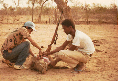 Lúc còn là tay mơ mới vào nghề, tôi xách súng đi lang thang cả ngày trong rừng savannah, trên núi tìm săn heo, nhưng không bao giờ gặp chúng. “Không thầy đố mầy làm nên”, tôi nhờ hỏi thăm mấy thanh niên trong làng nên được họ chỉ cách săn heo: hoặc ta đi tìm chúng, hoặc để chúng đến tìm ta. Tôi đã thử cả hai phương pháp và cả hai đều có hiệu quả tốt.