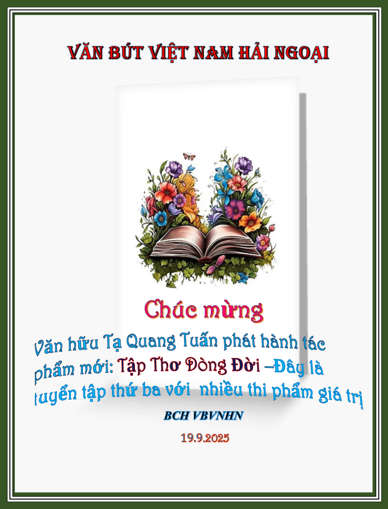 | Tiểu sử Tạ Quang Tuấn: Ông sinh tại Saigon. Tác giả sinh ra trong một gia đình gốc Bắc di cư. Thân phụ của tác giả là một thầy giáo, một nhà văn và là cựu hiệu trưởng trường trung học Nguyễn Trãi Saigon, Quận 4. Năm 1980 tác giả vượt biển rời Việt Nam. Tác giả tạm cư ở trên đảo Galang được 7 tháng trước khi đi định cư tại Canada, Montreal. Cuối năm 1990, tác giả qua Mỹ sinh sống và lập nghiệp cho tới ngày hôm nay. Hiện tại tác giả cùng vợ con đang sinh sống tại thành phố Gaithersburg thuộc tiểu bang Maryland. Tác giả là nhân viên trong bộ tài chánh của National Institutes of Health (NIH) của chính phủ liên bang. Tác giả đoạt giải nhì về văn-thơ tại hải ngoại của Văn Thơ Lạc Việt năm 2018. Ngoài công việc hàng ngày, tác giả còn rất thích làm thơ về quê hương và viết những truyện ngắn. Tập thơ đã in thành sách: 1- Hoài niệm-2020 2- Những dòng thơ tiếp nối-2024 3. Tập Thơ Dòng Đời Mọi liên lạc xin vui lòng gửi về: d.tuanta@gmail.com https://tuanquangta.wordpress.com/ |