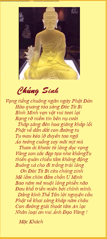| SOI BÓNG TỊNH TÂM Ta về Soi Bóng Tịnh Tâm Vô ưu một đóa thì thầm lục căn Tâm không lặng ngắm trở trăn Tham sân mê muội đường trần gian lao Đắm say danh vọng sang giàu Phù du mộng tưởng chỉ màu hư không Sá chi một kiếp nợ trần Tìm quên phù phiếm thăng trầm khổ đau Ta về ngồi đếm hư hao Chìm trong bể khổ thương đau kiếp người Lợi danh nhường lại cho đời Đường về cõi tịnh buông rơi nhẹ lòng Hành trang còn lại sắc không Bỏ luôn tạp niệm thân không, nhẹ nhàng. Nhìn lên vũ trụ thênh thang Ta là hạt bụi lỡ mang kiếp người Mai về vô thủy vô chung Ngộ ra mới biết mình không là mình ! Mặc Khách |