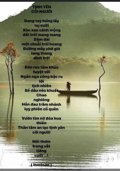 | Tôi Không Là Tôi không là gió mùa thu Làm sao giăng mắc sương mù chiều nay Tôi không là bóng mưa mây Làm sao tưới nước cho đầy dòng sông. Tôi không là gió phiêu bồng Làm sao xoải cánh trên đồng cỏ xanh Tôi không là kẻ lữ hành Viễn du thiên hạ, vòng quanh đất trời. Tôi không là cánh hoa rơi Làm sao biết được tình đời hợp tan Cõi lòng hòa nhịp chứa chan Chiều nghiêng xế bóng mây ngàn sơn khê. Ta về dấu bụi đường quê Phù sinh quảy gánh lối về hư không Tìm quên trong cõi bụi hồng Trăm năm thiên cổ một vòng trường sinh. Đất trời khai mở hành trình Tiền thân hạt bụi ân tình nở hoa Một vùng ánh sáng chói lòa Soi trong tiềm thức, chan hòa tình thương. Lê Tuấn (Bài thơ này đã được Nhạc sĩ Phạm Đức Huyến phổ nhạc) Tập thơ Tình yêu Của Tôi 2019 https://youtu.be/tNgCpbaM-Xs |
