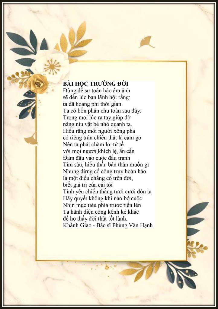 | 7 Nghệ thuật sống kiếp người 1-Nhìn thấu lòng người, không cần bày tỏ mà chừa cho họ một con đường chừa cho ta khẩu đức vẹn toàn 2-Trách người ta không cần hà khắc chừa cho họ một chút thanh danh giữ độ lượng tinh thần ta cao 3-Tài năng không cần phô trương hết dành cơ hội cho người khác trổ tài giữ tâm sâu sắc an hòa 4-Có công lao không nhận hết cho ta mà chuyển cho người khác một vài như thế mới gọi là khiêm cung 5-Hiểu hết lý lẻ không tranh cải mà mở đường cho lẻ phải luân lưu giữ niềm thân ái với nhau 6- Được yêu quí, không cậy hết vào xẻ cho người chút ít vui vầy anh em 7-Giàu sang không hưởng cho mình riêng chia cho người chút ít, êm đềm vui thay Đời đáng giá chớ sống qua loa Khánh Giao-Bác sĩ Phùng Văn Hạnh |