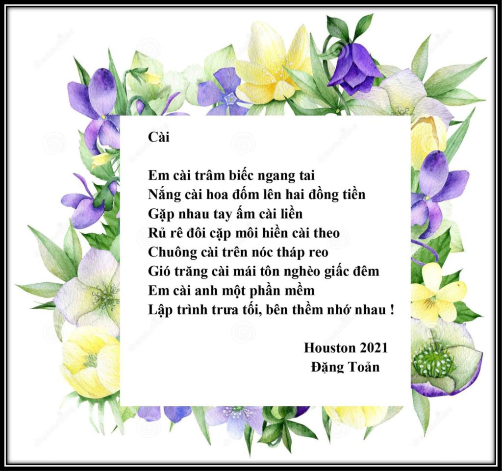 | Anh đi Anh đi nắng trải hoàng hôn Mờ trông xa khuất , tình chôn ưu phiền Anh đi bóng ngã gầy hiên Môi thơm em hắt hiu miền cô đơn Anh đi lòng nhủ… hàm ơn Người xa, âu dỗ dành cơn đau vùi Anh đi nhớ ngậm, trông ngùi Bên song trăng gối thương bùi ngọt xưa Anh đi nắng hỏi thầm mưa Còn ai đường cũ sớm trưa,vai kề Anh đi sầu nhão , buồn khê Day lưng, niềm nhớ quay về gọi tên Anh đi tình giục rằng…quên Thật nhanh hầu giữ độ bền van tim Anh đi nắng bỏ đồi sim Lang thang mây cũng trôi tìm cuộc say Anh đi đêm rủ rê ngày Chia qua, sớt lại… thêm dày mộng đôi ….. Anh đi…Tình soán đoạt ngôi.. ……. Sầu rưng này đóa em ngồi Ngự trên! Houston 12 – 2018 Đặng Toản |