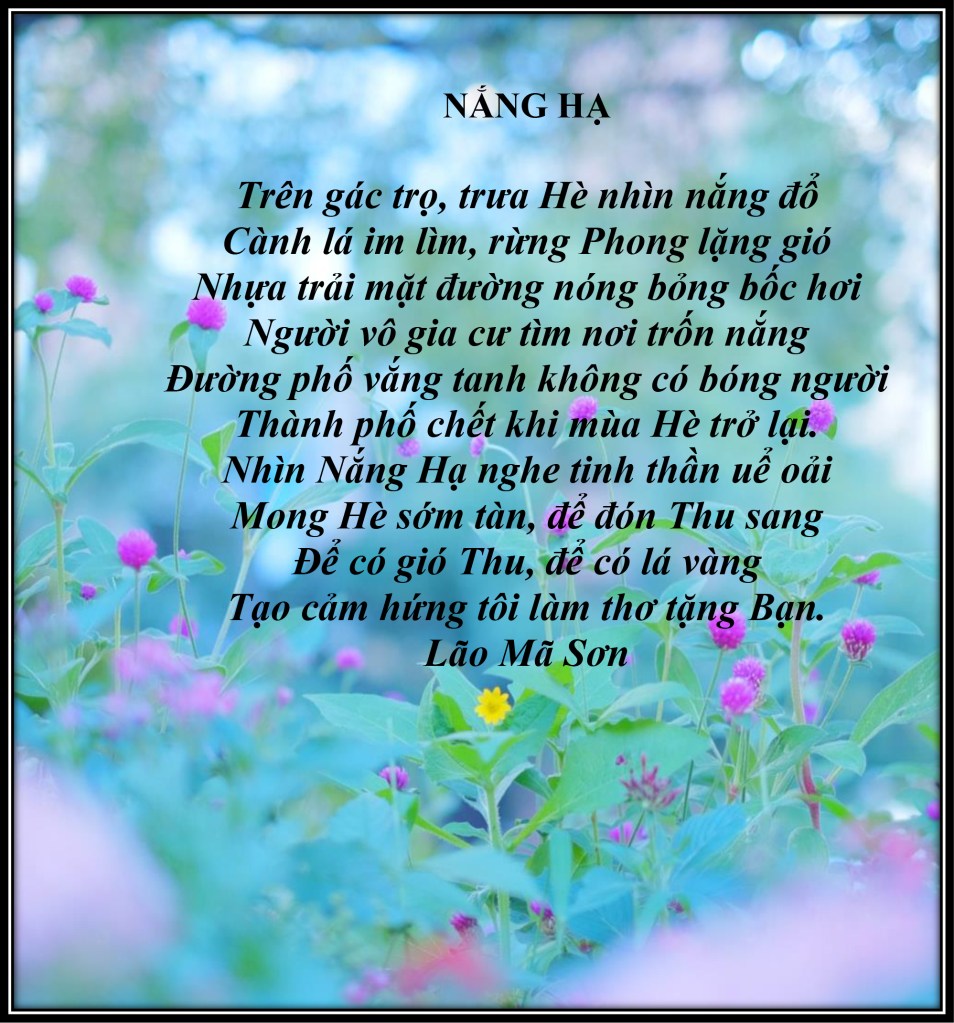 | TÔI LÀM THƠ Tôi không là thi sĩ Tôi chỉ là tay mơ Cô đơn trên gác trọ Buồn, tập tành làm thơ. Tôi không có tham vọng Được trở thành nhà thơ. Thơ tôi để tặng bạn Chưa in sách bao giờ. Nhờ bạn bè khích lệ Tôi hăng say làm thơ. Nay thơ là hơi thở Ngày còn gõ máy nổi Ngày đó còn làm thơ. Ngày lên tàu thiên cổ Rời máy Computer Từ đó hết làm thơ. Lão Mã Sơn |
