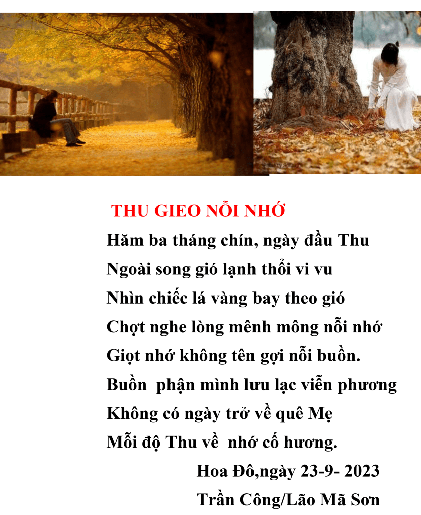 | THU GIEO NỖI NHỚ. Hăm ba tháng chín, ngày đầu Thu Ngoài song gió lạnh thổi vi vu Nhìn chiếc lá vàng bay theo gió Chợt nghe lòng mênh mông nỗi nhớ Nhớ bạn bè xưa còn ở Sài Gòn Không biết nay ai mất , ai còn Nhớ cố nhân thăm tôi lần cuối Lệ lưng tròng trong buỗi chia tay. Nhớ SàiGòn, một góc của quê hương Giờ nầy Sài Gòn đang mưa hay nắng? Bến Bạch Đằng những chiều tắt nắng Người Sài Gòn còn hóng gió như xưa? Bao nhiêu nỗi nhớ bấy nhiêu buồn Buồn phận mình sống kiếp tha phương Mỗi độ Thu về trên đất khách Bâng Khuâng buồn, thương nhớ cố hương. Hoa Đô, ngày 23-9-2023 Trần Công/Lão Mã Sơn HÔM NAY MỚI THỰC VÀO THU ( Kính gửi anh Hai thi sĩ Lão Mã Sơn – Trần Công ) Vào thu rồi đó nghe anh . Gió thu man mác động cành lá rơi . Vàng thu mai mốt cùng trời , Chim nằm bờ ổ không lời hát ca … – Buồn thiu gợi nhớ Quê nhà , Ngàn trùng cách trở bao giờ về đây ?! Tuổi già ngong ngóng nhớ ai , Năm xưa từng hẹn chung xây mộng vàng . Ngờ đâu cuộc chiến bạo tàn, Vỡ tan mộng ước – như đàn đứt dây … Tuổi già tóc bạc sương mai , Nỗi lòng biết ngỏ cùng ai bây giờ …! THƯ KHANH – Seattle- Đầu thu – 9/24/2023 . |