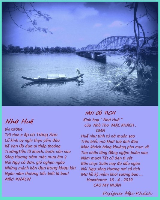 Cô Liêu![]() Sông thu nhè nhẹ sóng cô liêu Chiếm lấy hồn ta suốt buổi chiều Thoảng tiếng chuông chùa Thiên Mụ gọi Ru hồn mục tử tiếng thông reo Cảnh đó người đây sầu cổ độ Người về Tây Trúc gió trăng theo Đêm tiếp nối ngày… mòn mỏi đợi Hồn ta tơ tưởng một đôi điều… Thư Khanh Seattle- 2021 |