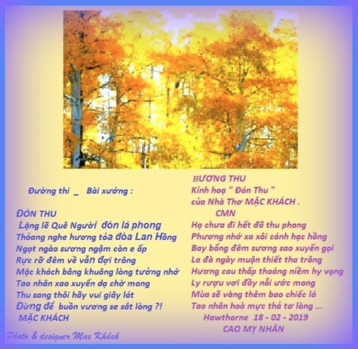 | THU Hạ sắp tàn, hoa Cúc vàng chớm nở Thi nhân hớn hở chờ đón Thu sang Phong cảnh mùa Thu rực rỡ huy hoàng Tạo cảm hứng cho thi nhân sáng tác. Lữ khách xa nhà, lòng buồn man mác Nhớ nước, nhớ nhà, buồn cảnh tha phương Mỗi độ đón Thu Về trên xứ lạ Chợt nghe lòng mình thương nhớ cố hương. Hoa Đô 2021. Lão Mã Sơn |