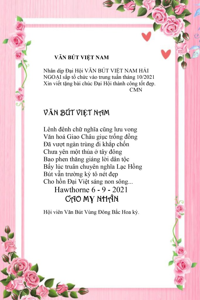Thơ Đã Đổi Vần![]() Bụi cúc hoe vàng một góc sân Kìa như lấp ló bóng thu gần Loay hoay mấy chốc vàng thu lửa Thảng thốt đâu ngờ điệu sóng ngân Bỡ ngỡ tình đầu trao nghệ sĩ Bâng khuâng đoạn cuối đợi thi nhân Hương thu lãng đãng vờn trong nắng Có phải lời thơ đã đổi vần. Lê Mỹ Hoàn 9/10/2021 |