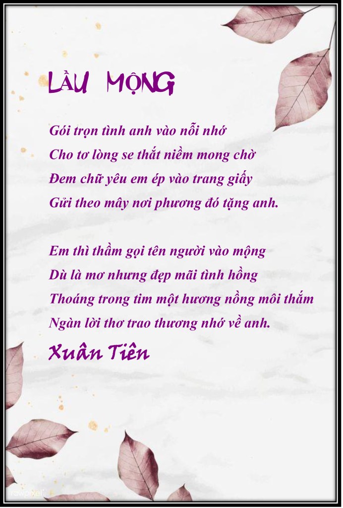 | Giọt Lệ Vào Xuân Giọt lệ vào xuân thấm cõi lòng Nhìn trời đất rộng tỏa mênh mông Mai đang chụm cánh khoe hương sắc Đào mới đơm bông thắm nhụy hồng Dịch rút âm thầm năm đã hết Đời tuôn rộn rã Tết vừa trông Đền chùa tiếng khánh chuông êm ả Cầu nguyện tròn năm vẹn ước mong. Lê Mỹ Hoàn 12/27/2021 |